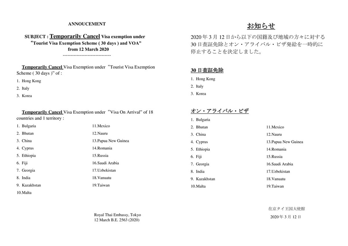 タイ政府は2020年3月12日より、新型コロナウイルス感染のリスクが高いとされる韓国・イタリア・香港に人々に対するビザ免除の停止と、19の国と地域が対象の到着ビザ(VISA... Continue reading