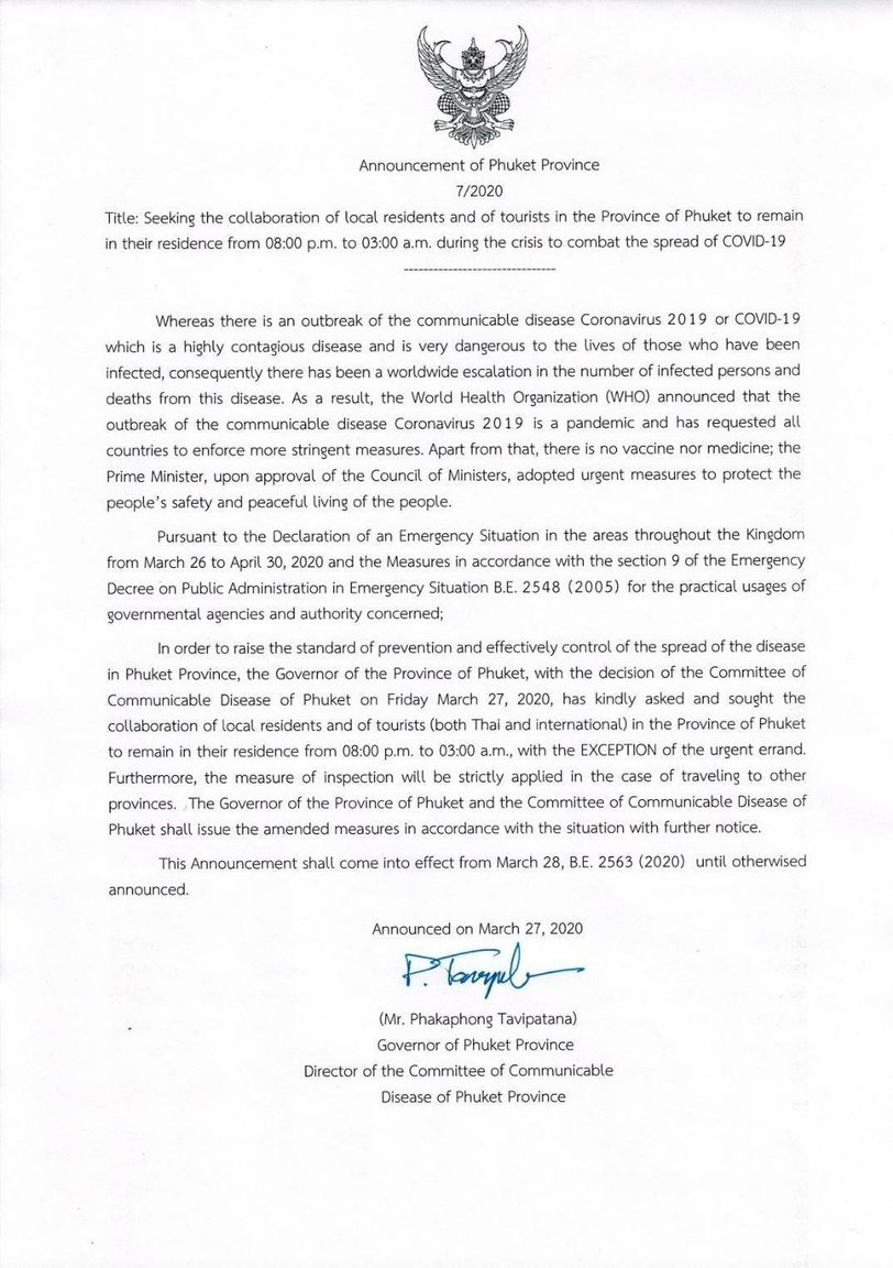 プーケット県は2020年3月28日に公式フェイスブックページにて、新型コロナウイルス感染拡大を抑制するために、全ての人々に対して、午後8時から午前3時まで外出の自粛を求めると発表しました。この発表は同日3月28日より有効になります。