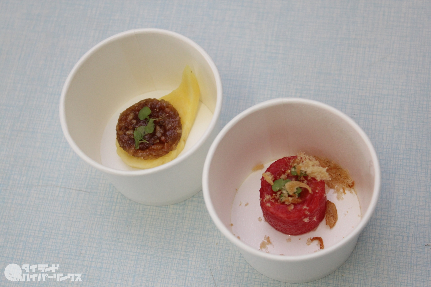 アミューズブーシュはスイカを使った「 Sing Buri Triple Cooked Sun Dried River Fish Mixed With Sugar and Deep Fried Shallots Served with Watermelon」とパイナップルを使った「Fresh “HOM Suwan” Pineapple Morsel topped with Minced Pork and Peanut」の2品。