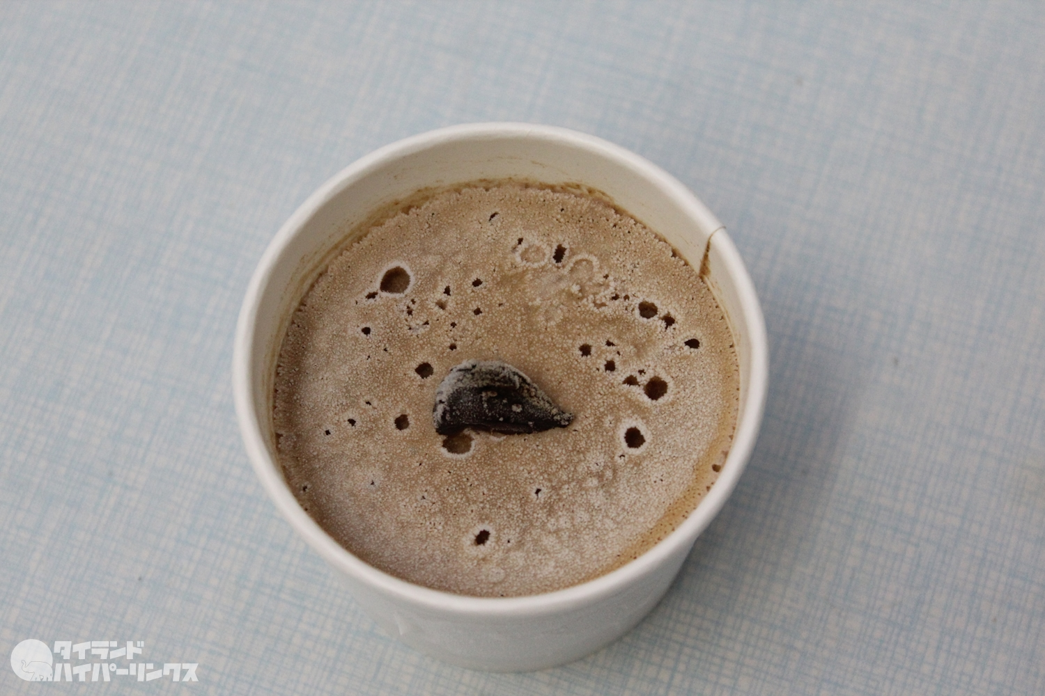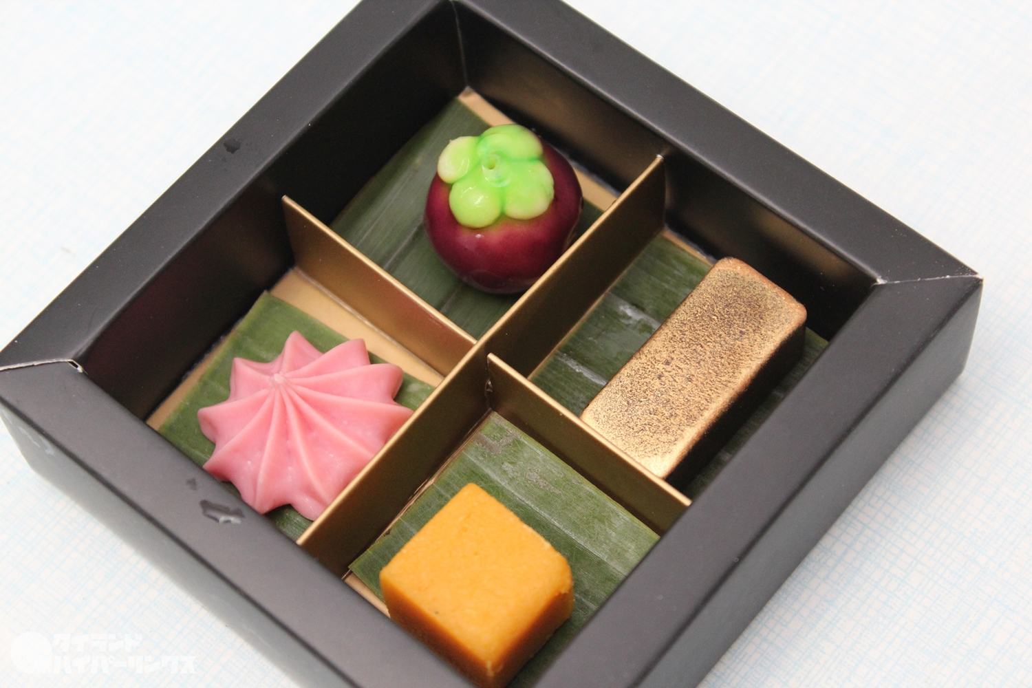 カスタードプリン(「Egg Custard with 110 Days-Harvested Esarn Pumpkin」)、糯米をローストする一工夫を加えたカオニャオマムアン(「Roasted Mango Sticky Rice with Banana Leaf served with Mahachanok Ok Rong Mango Sauce)」、黒ニンニクがアクセントのミルクアイス(「Lumpoon Black Garlic and Fresh Milk Ice Cream」)、そして、黒いボックスに入った小さな可愛いデザートが4つ揃った「Petit Four」。