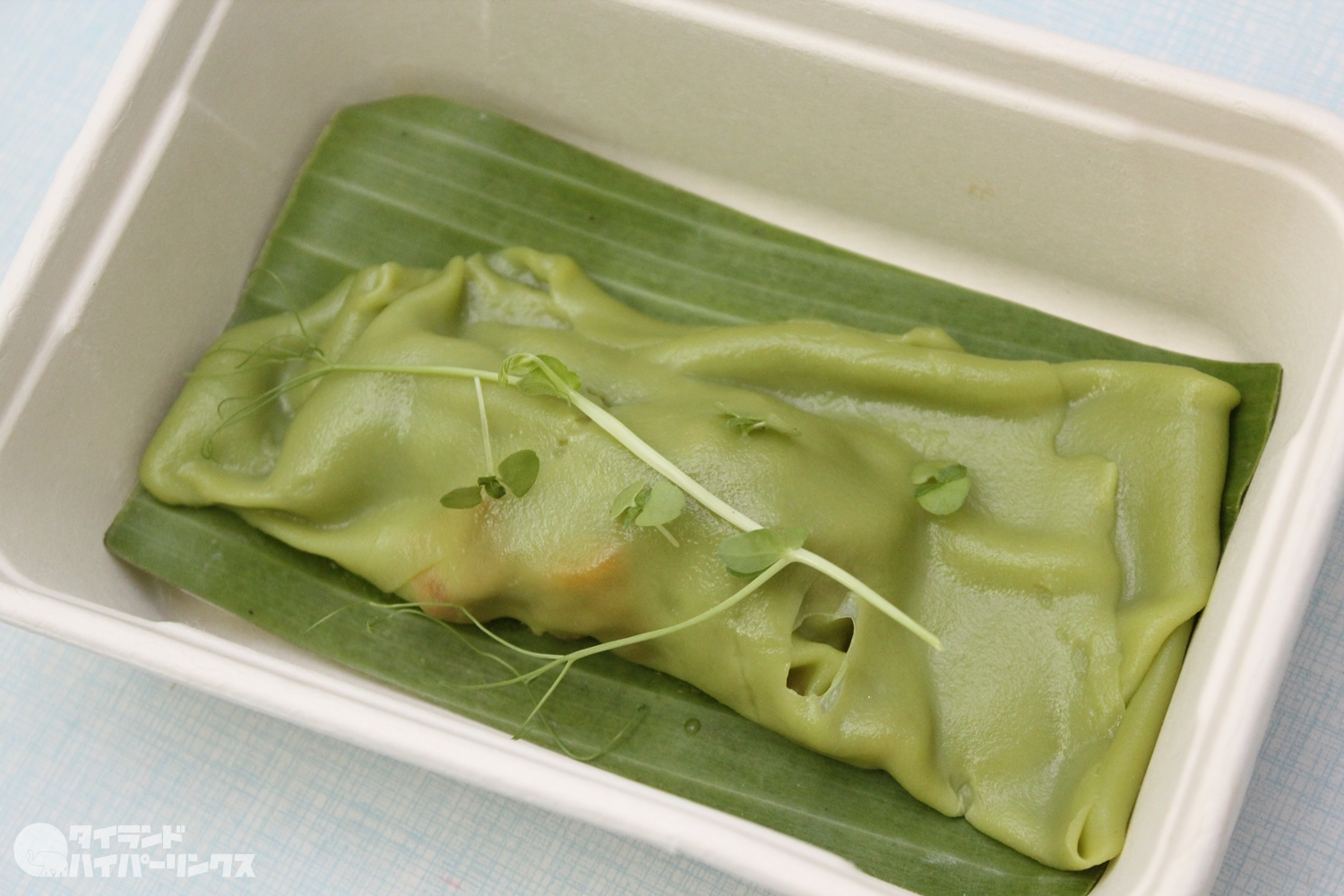 アペタイザーは4品もあります。ボンタンを使った「Traditional Siam Ruby Pomelo Salad From Nakhon Si Thammarat」、ツボ草を練り込んだ皮でパッタイを包んだ「Fish Noodle Pad Thai Wrapped with Gotu Kola Leaf」、タイ・ロイヤル・プロジェクトの一環で作られたチーズと手製のえびせんべいを組み合わせた「18 Months Fermented Fish and Thai Herbs Break with Cheese serve with Homemade Prawn Crackers」、牛肉の旨みたっぷりの「 30 Days Dry Aged Buriram Angus Beef grilled with Salt, Fish Sauce, Black Pepper」。
