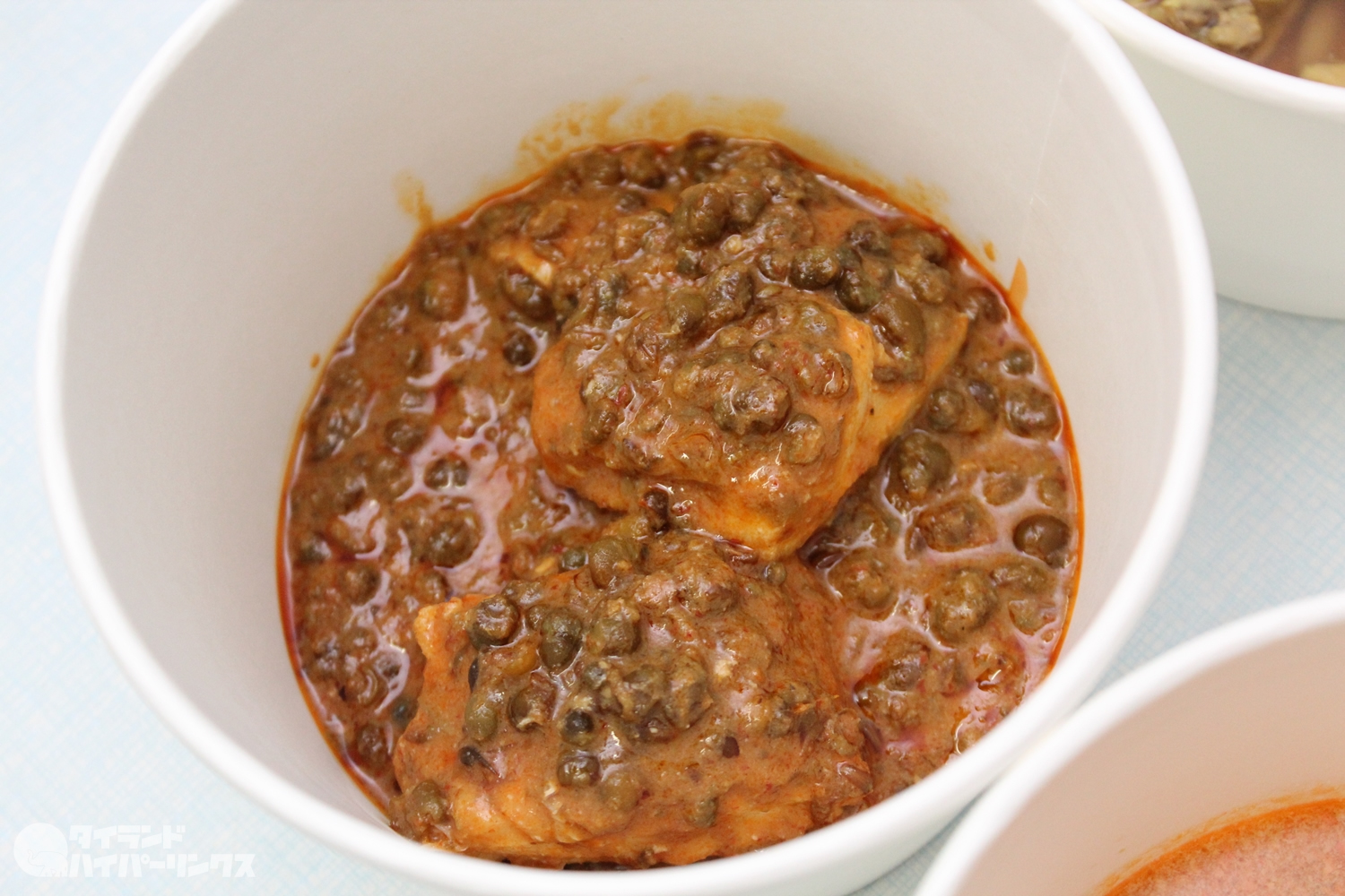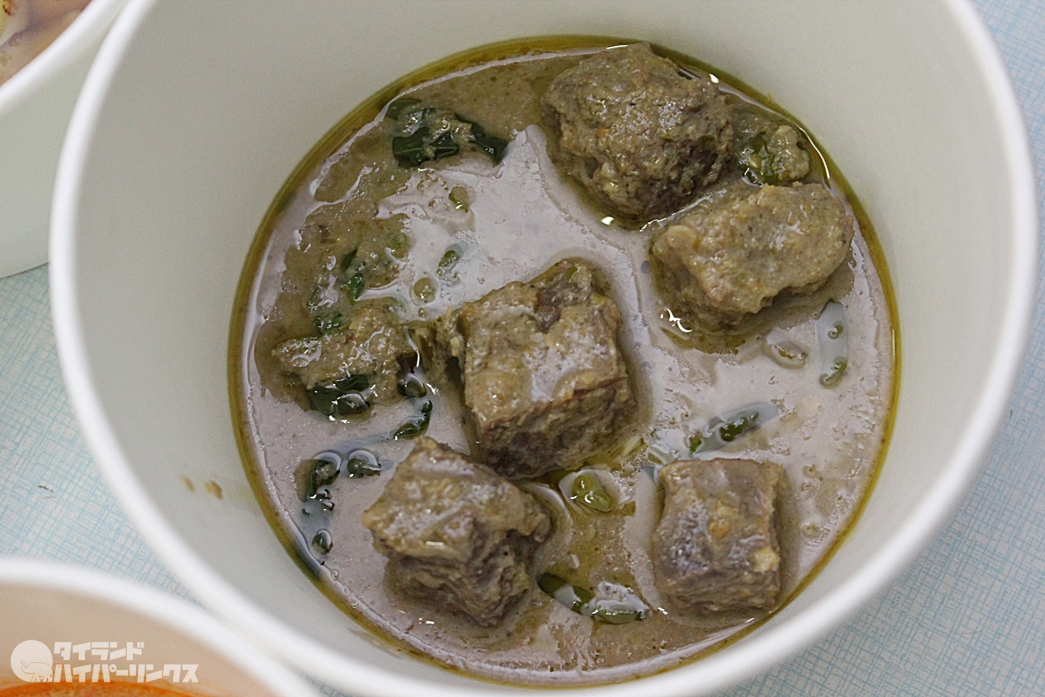 シェフが発見した大昔のレシピに基づいたカレー(「Ancient Thai Copper Pod Curry “Kaeng Khe Lhek” With Sea Grouper」)かコラート産和牛を使ったグリーンカレー(「Korat Wagyu Beef Short Rib Green Curry and Fresh Chili」)、