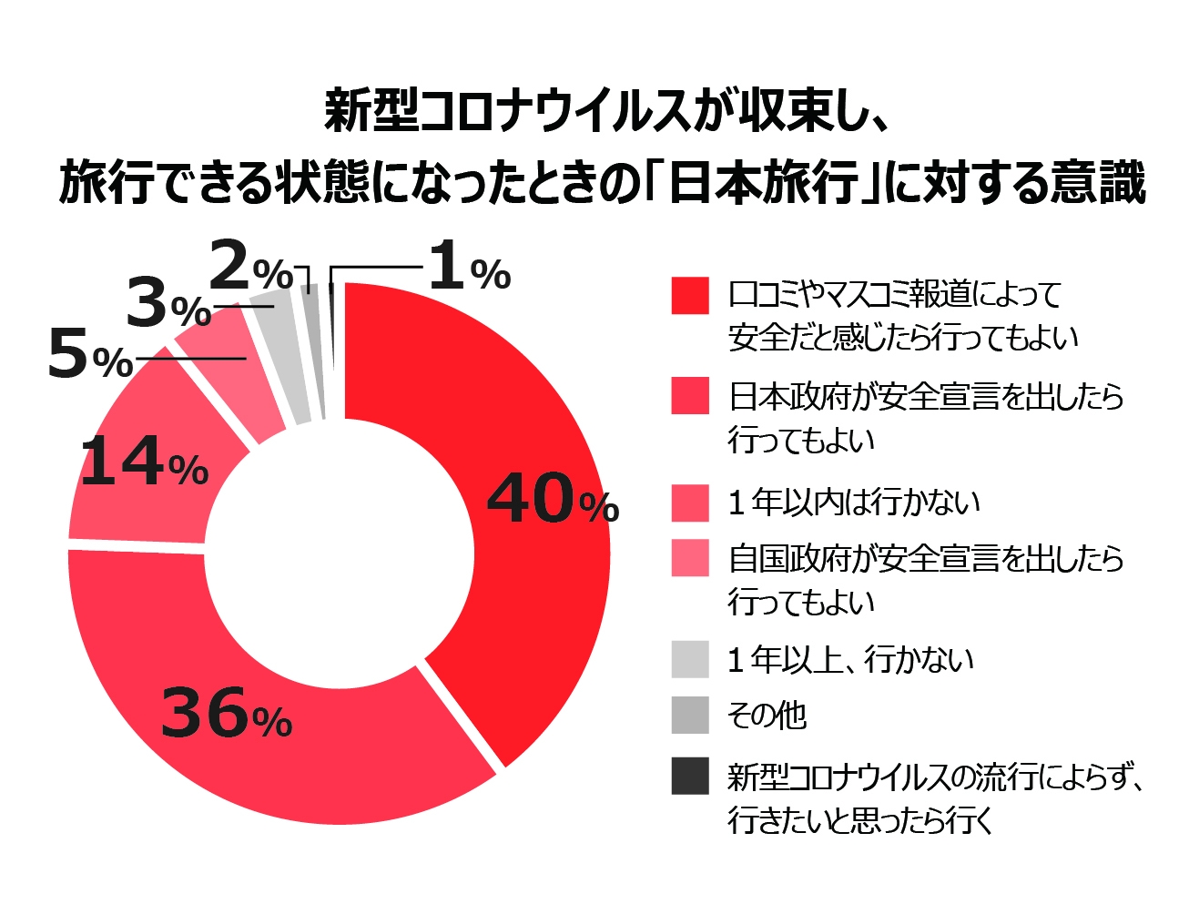 訪日旅行については約82% が前向きに捉えていることが分かりました。「口コミやマスコミ報道によって安全だと感じられたら行ってもよい」との回答が約40%に上り、口コミやメディアによる情報発信が訪日旅行者数復活のカギとなりそうです。一方で、1年以上行かないという回答が約5%と、訪日旅行への影響は皆無とは言えないものの、いたって限定的であると分かります。