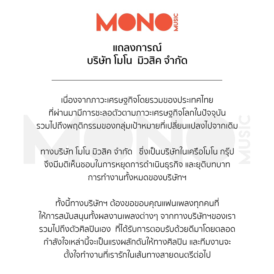 音楽事業を行うMONO MUSICは2020年5月25日、公式Facebookページを通じて事業中止を発表しました。MONO MUSICは、テレビ局MONO29やウェブメディアM Thaiなどを有するMONO GROUPの子会社です。