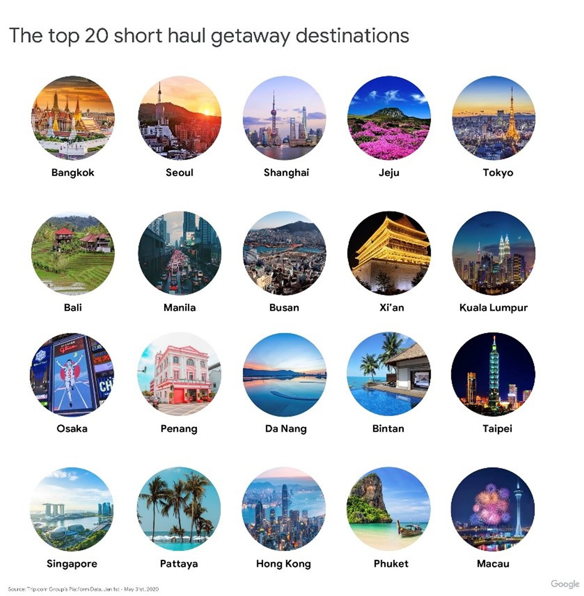 「Trip.com GroupとGoogleによる旅行トレンドレポート」によるで特定された、アジア太平洋地域の「短期旅行先人気Top 20」。