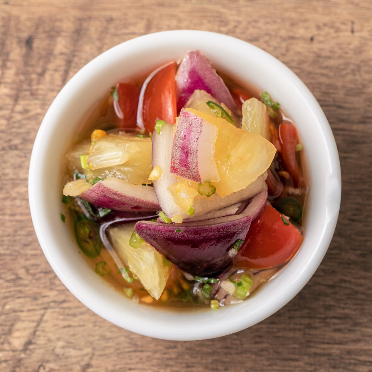 味のアクセントに胡瓜、赤玉ねぎ、パイン、トマトが贅沢に入ったざくざく触感がおいしいエスニックなタレ。