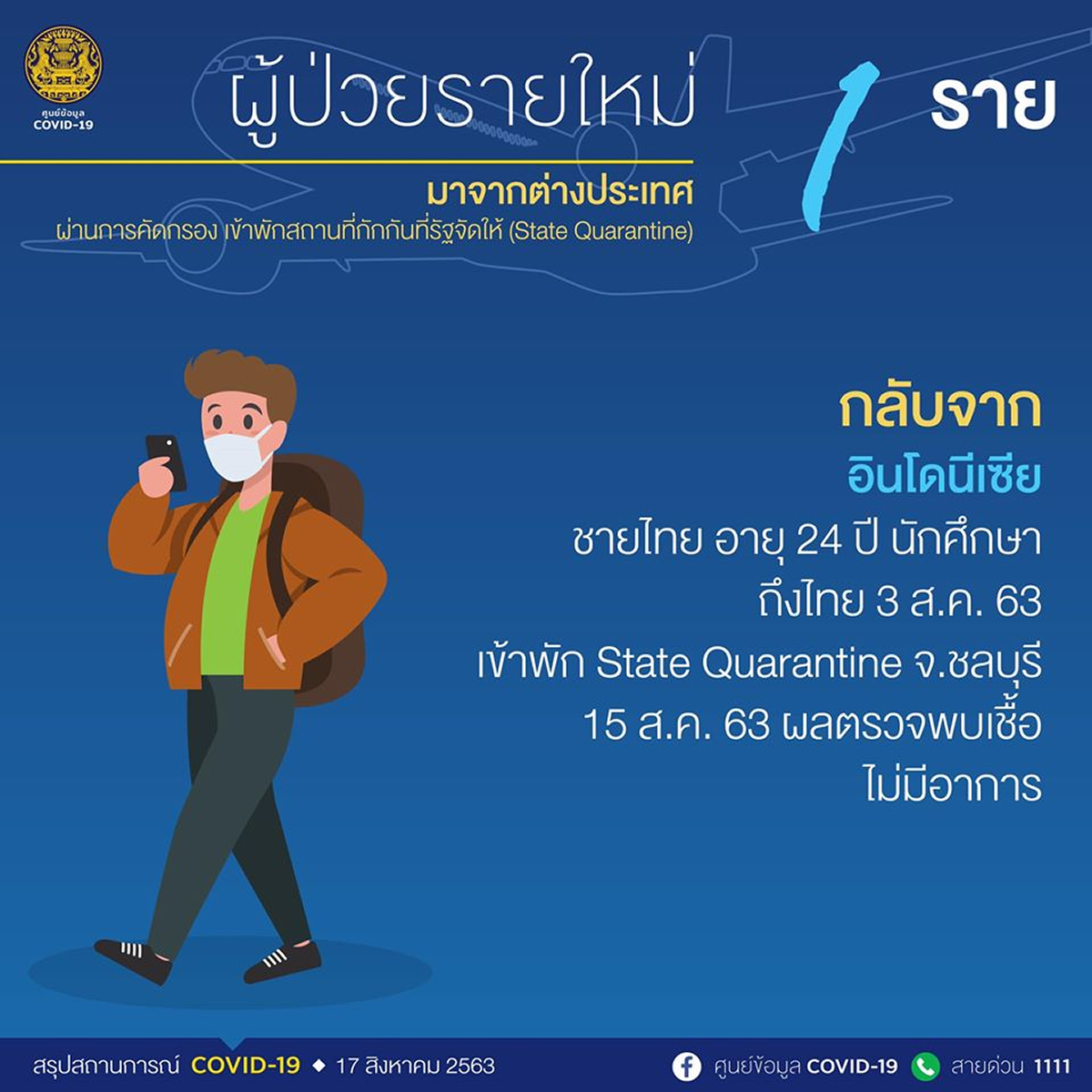 新規の1人は、8月3日にインドネシアからタイに帰国した24歳のタイ人男子学生。チョンブリの隔離施設に滞在中で症状はありません。