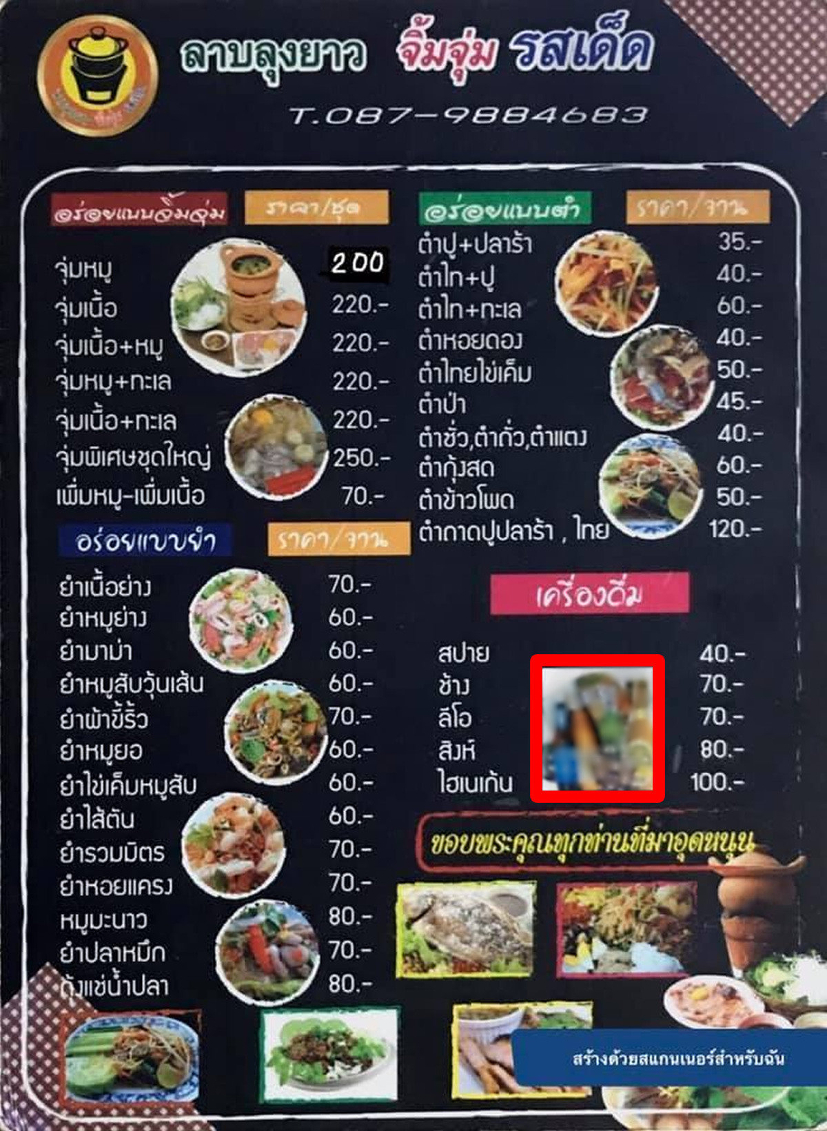 ノンタブリー県パーククレットにあるソムタム食堂「ラーブルンヤーオ(ลาบลุงยาว)」に、アルコール飲料の宣伝を禁止するアルコール規制法第32条違反で、1万7000バーツの罰金が科されました。