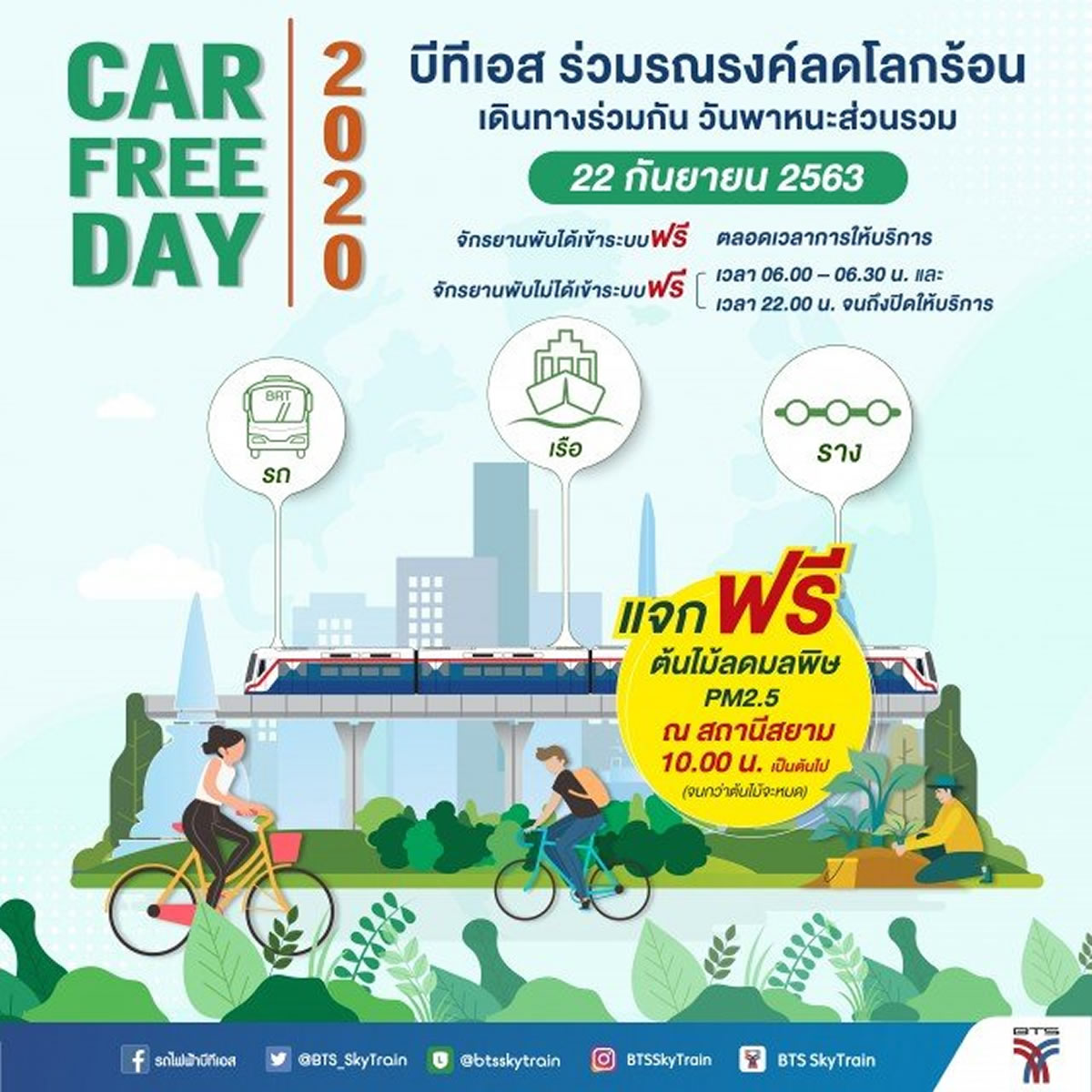 2020年9月22日(火)は、自動車を使わないことを推奨する「カーフリーデー(車のない日)」。バンコク都市鉄道のBTS(スカイトレイン)では、自転車を利用するサイクリストの運賃を無料とするキャンペーンを実施します。