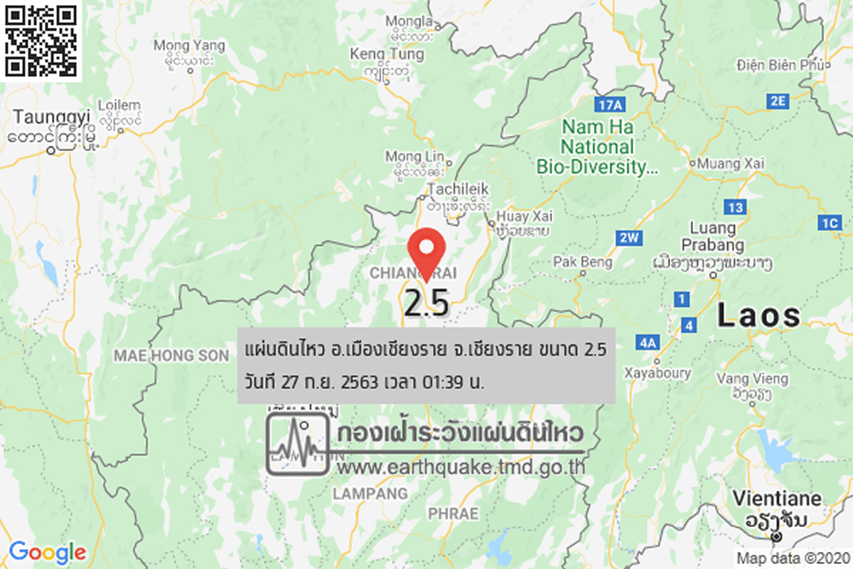 2020年9月27日午前1時39分、タイ北部チェンライ県ムアンチェンライ郡を震源とするM2.5の地震が発生しました。