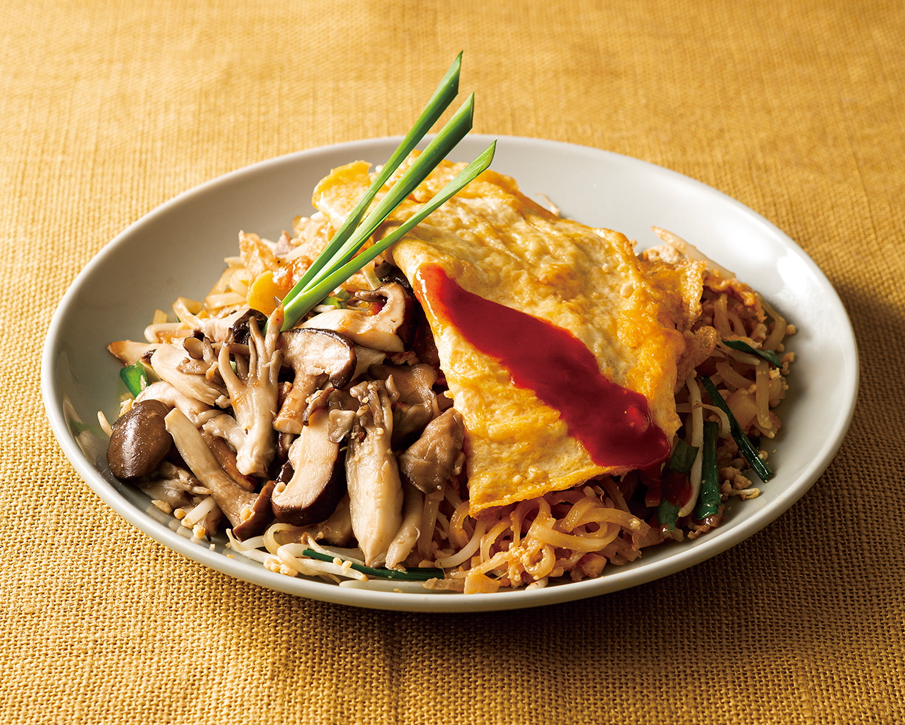 いろいろきのこと甘じょっぱ酸っぱいパッタイソース、自社製のもちもち生米麺が絡んで食が進む一皿。薄焼き卵とチリソースがアクセントに。