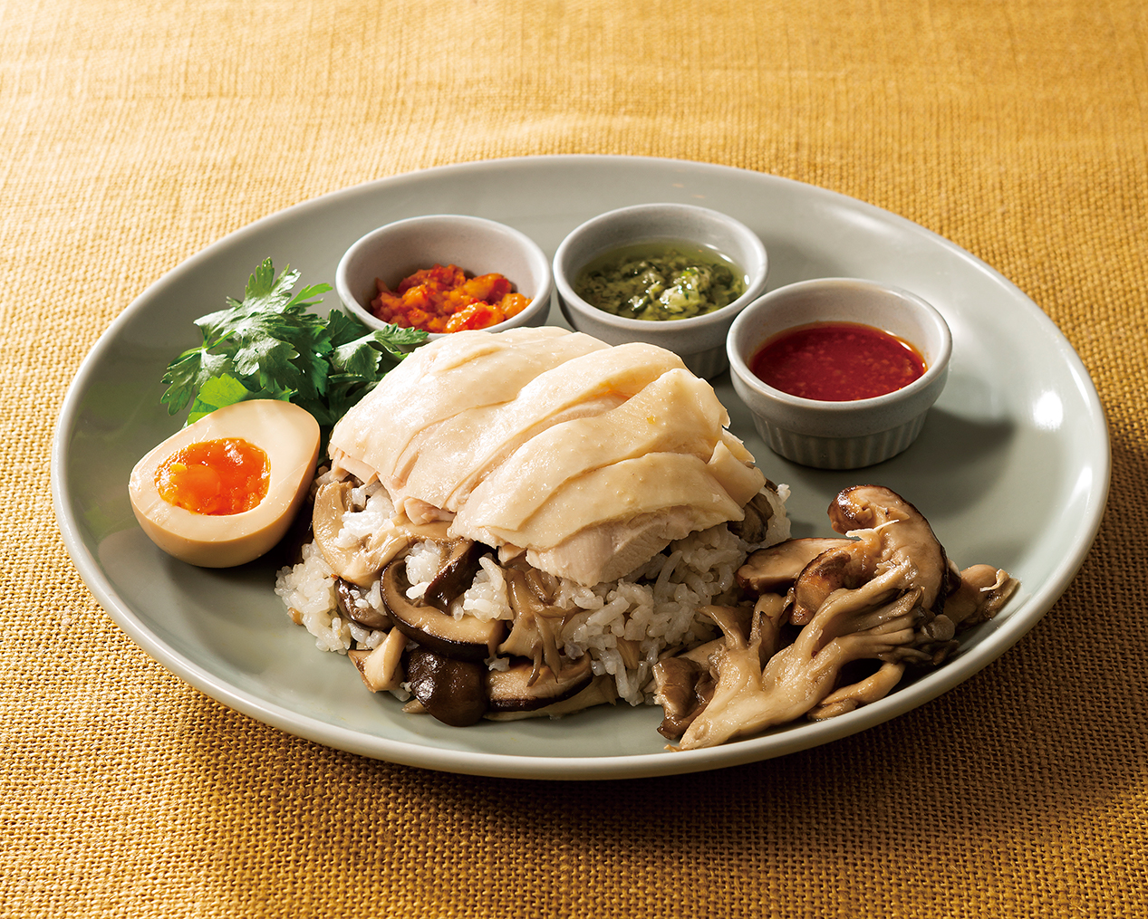 きのこをカオマンガイのご飯と混ぜ合わせて、その上に茹で鶏をのせ、