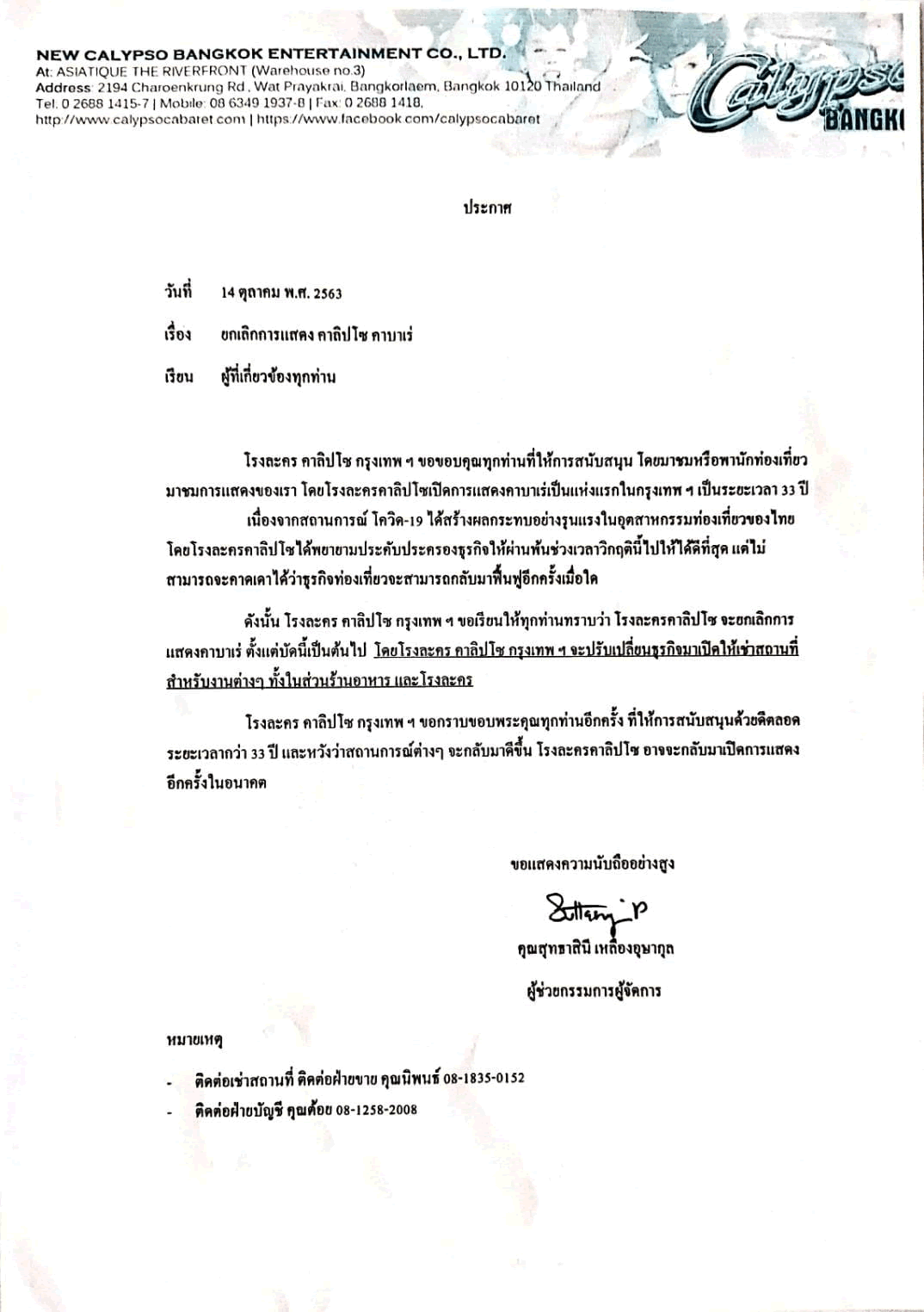 バンコクのキャバレーショーの老舗である「カリプソ(CALYPSO)」が2020年10月14日、33年間に渡って行っていたニューハーフショーの終了を発表しました。