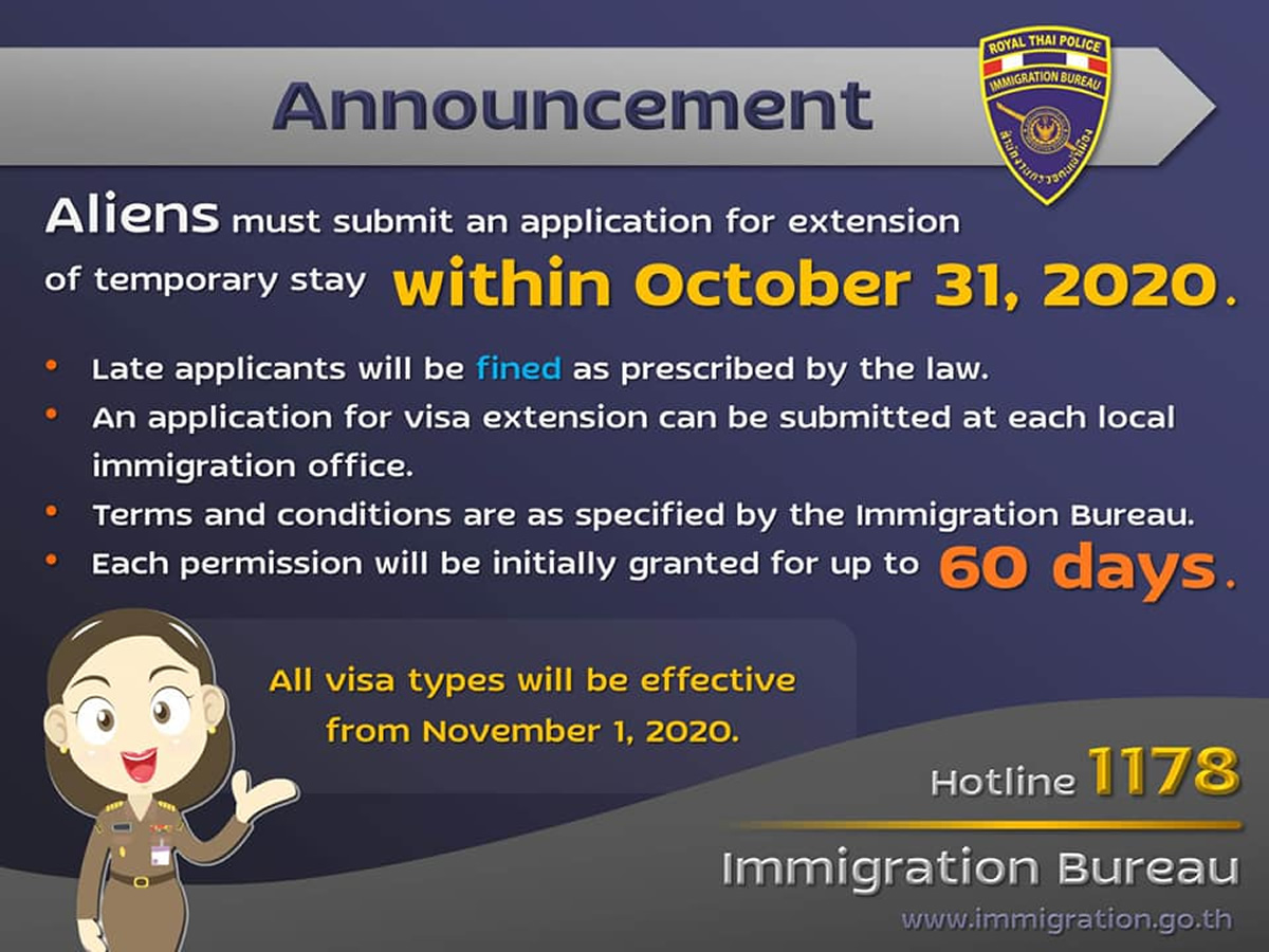 タイ入国管理局は2020年10月26日、新型コロナウイルス感染拡大の影響でタイ国内に足止めになっている外国人観光客に対して、滞在期間延長についてのアナウンスを行っています。