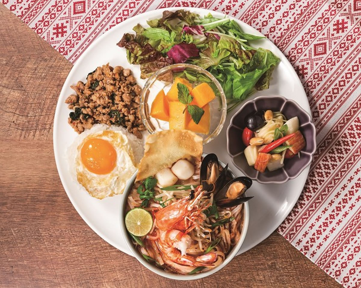 天草産の身が柔らかな車海老がのったトムヤムヌードルに、ガパオやフルーツソムタム、フレッシュマンゴと、タイ定番の人気メニューがそろって大満足のプレート。