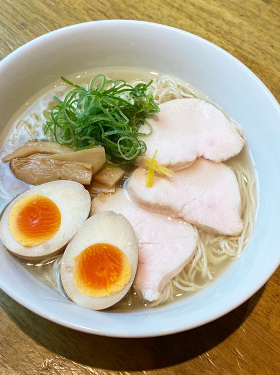 鶏ガラと野菜を焼いて炊き出して素材の旨みをじっくりと抽出したスープに、天然の旨みとミネラルをたっぷり含んだ藻塩で味を整えました。