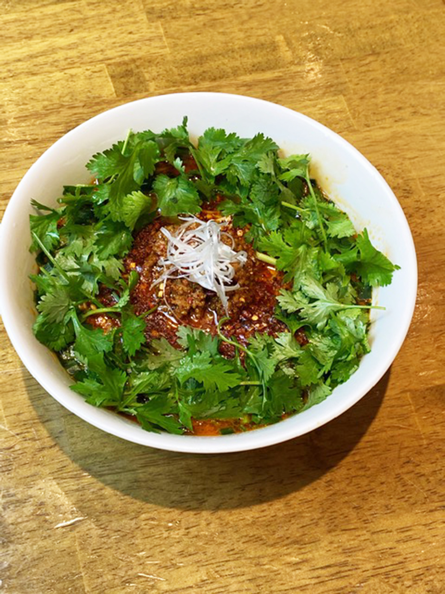 自家焙煎の赤唐辛子と、特製辣油、ニンニク、生姜、豆板醤、甜麺醤、芝麻醤で仕上げた肉味噌を加えた本格的な担々麺です。ひとくち目でお口の中に旨みが広がり、ふたくち目で汗が噴き出す!辛いものが苦手な方、心臓の弱い方はご遠慮ください。最後にご飯を投入する「追い飯」でスープまで余すことなくお楽しみください。