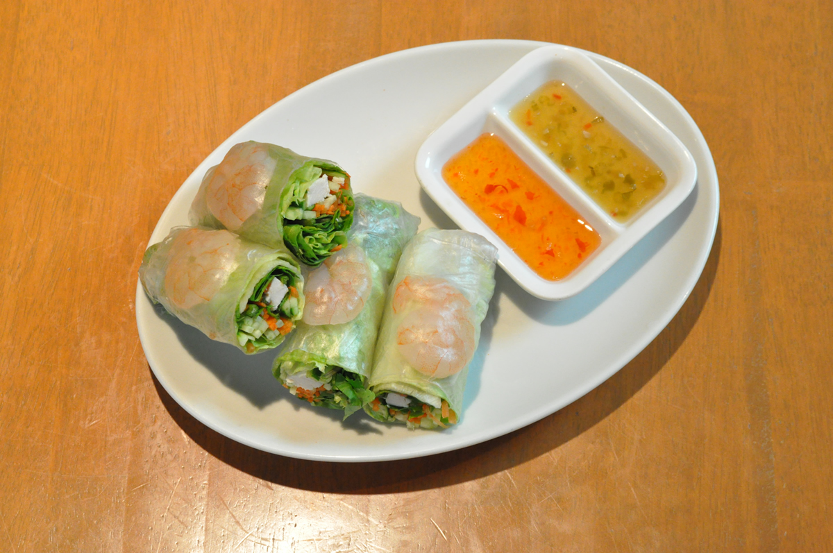 数量限定のパクチー料理の前菜として、ヴェトナム風の生春巻きを提供しています。ヴェトナム産のライスペーパーに新鮮野菜と蒸し鶏、エビ、パクチーを巻き込みました。添えられた2種のソースは甘辛のスイートチリと