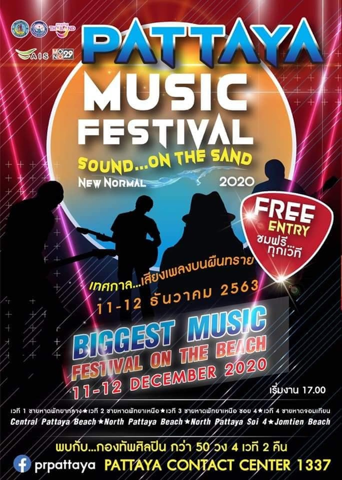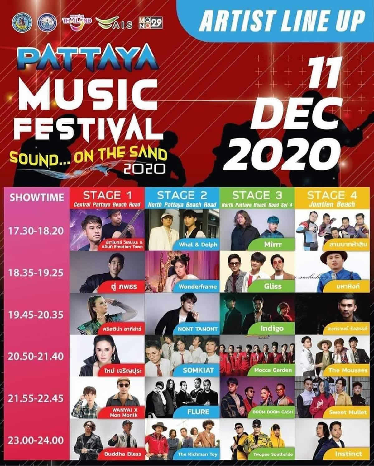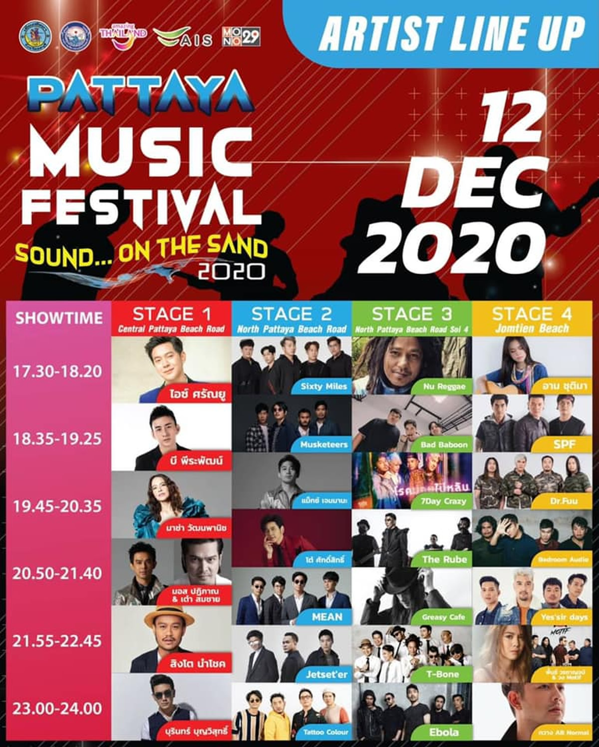 「Pattaya Music Festival 2020」のステージが設置されるのは、セントラルパタヤビーチロード、ノースパタヤビーチロード、ノースパタヤビーチロードsoi4、そしてジョムティエンビーチの4箇所。各ステージに有名アーティストらが登場し、午後5時半から深夜0時までの開催となります。