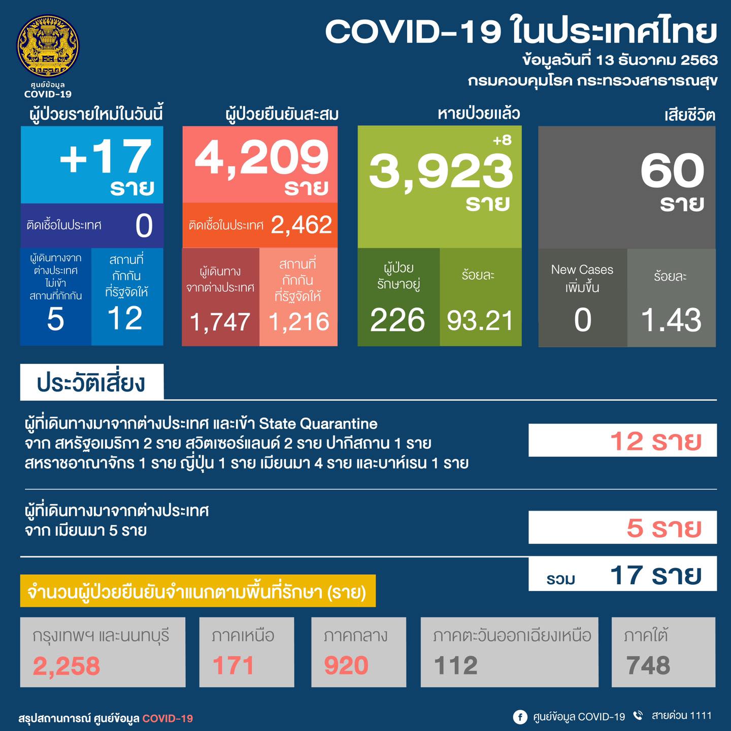 12月13日の発表で、タイで新規に確認された陽性の数は17人。そのうち12人は日本など海外からタイに入国し隔離検疫中のタイ人及び外国人。5人は感染拡大中のミャンマーから帰国したタイ人です。