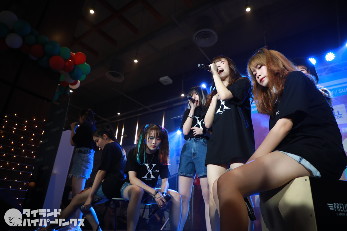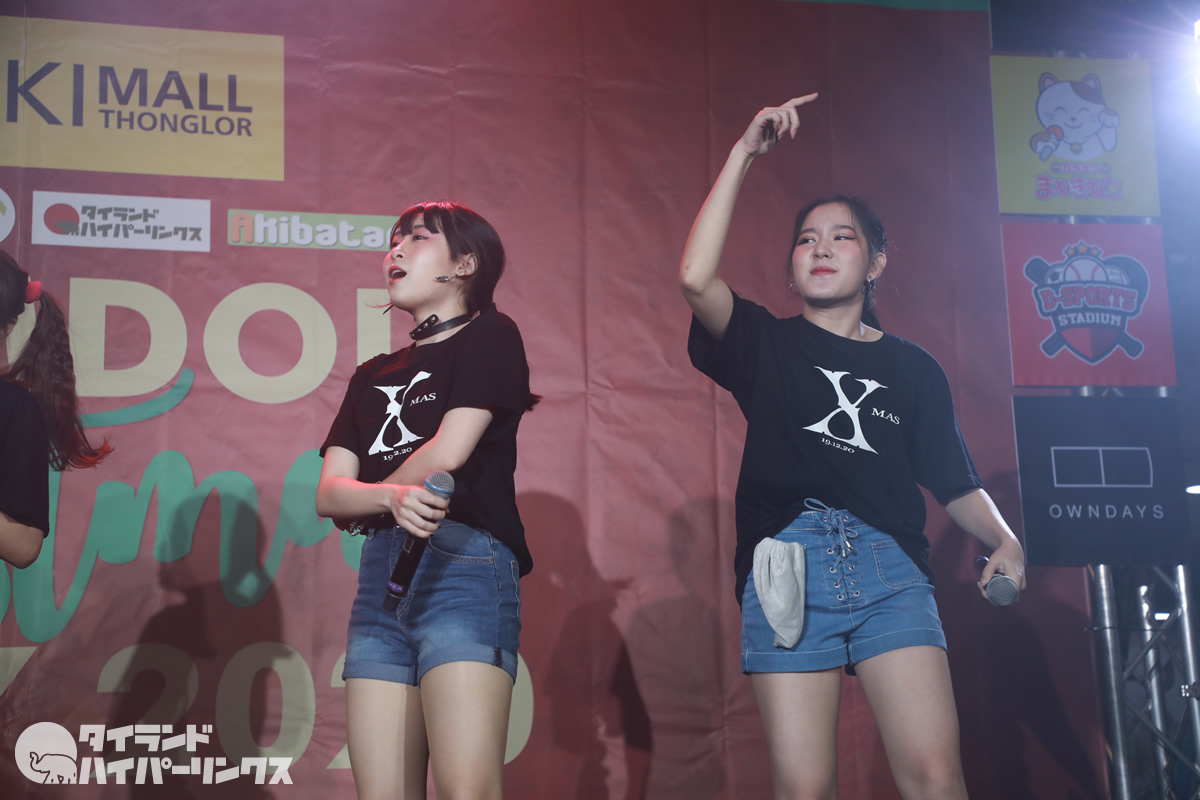 11人のアイドルグループ・Hatobitoは、おそろいのFIFAのジャンパーでステージに登場。前回9月のSiamdol主催ライブに登場した際は本格デビュー前でアニメソングのメドレーのみでしたが、この日はデビュー曲の「HeatBeat」を披露しました。さらにジャンパーを脱ぎ、X JAPANを彷彿とさるXmasの文字の入った黒のTシャツ姿になると、X JAPANのメドレーでXmasを祝福したのでした。
