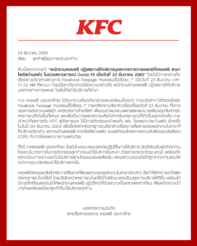 KFC(ケンタッキーフライドチキン)は2020年12月24日、新型コロナウイルスのクラスターが発生したサムットサコン県で、医療従事者へのサービスの提供を拒否した件について謝罪の声明を公式Facebookページに掲載しました。