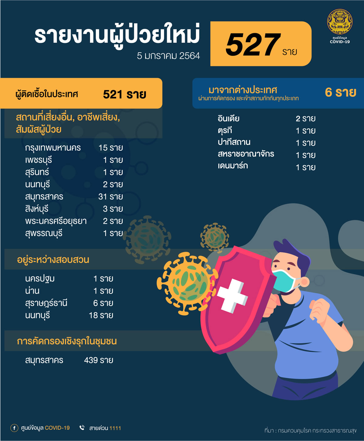 タイCOVID-19状況管理センター<the Centre for Covid-19 Situation Administration:CCSA>は2021年1月5日、新規に新型コロナウイルス陽性の527人が確認されたと発表しました。