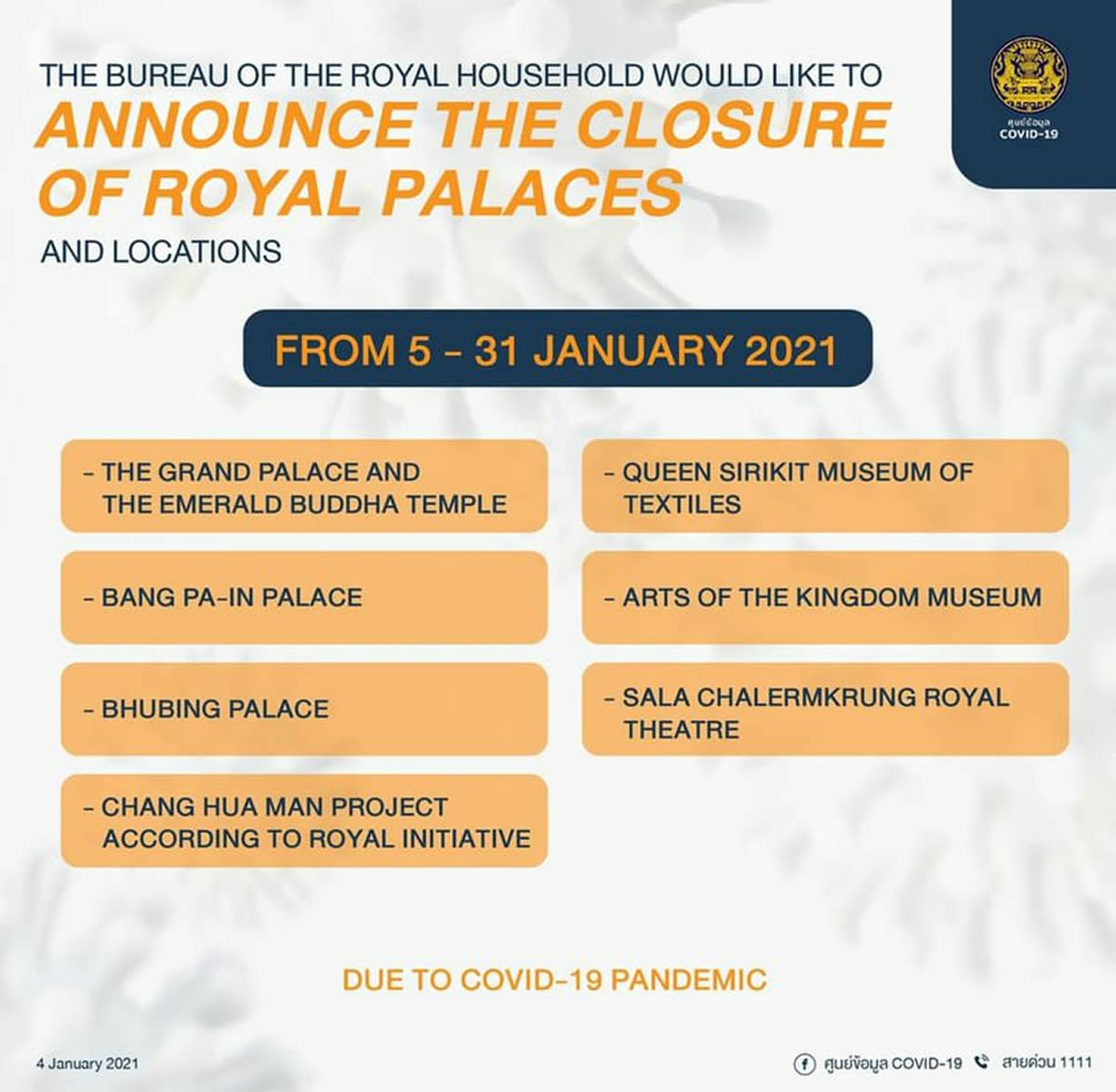 タイ王室庁(Thai Royal Household Bureau)は2020年1月4日、新型コロナウイルス感染拡大対策のため、以下の7つの施設を、2021年1月5日から31日まで一時閉鎖すると発表しました。