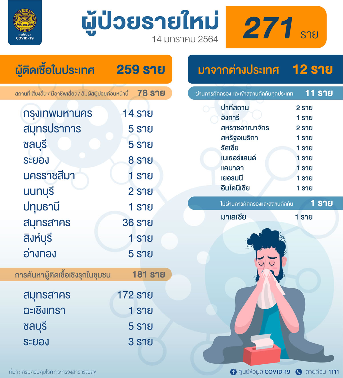 タイCOVID-19状況管理センター<the Centre for Covid-19 Situation Administration:CCSA>は2021年1月14日、新規に新型コロナウイルス陽性の271人が確認されたと発表しました。