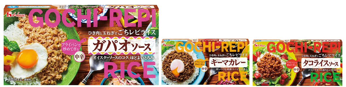 「ごちレピライス」は、<キーマカレー><タコライスソース><ガパオソース>と、フライパンを使って手軽に作れるプチごちそうメニューのラインナップが揃いました。忙しい毎日の彩りとなるようなメニューをお楽しみいただけます。