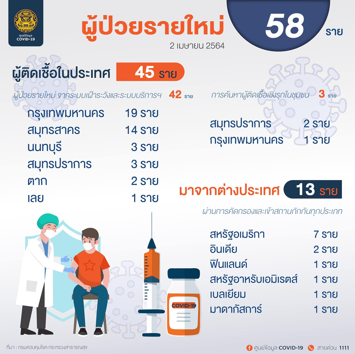 タイCOVID-19状況管理センター<the Centre for Covid-19 Situation Administration:CCSA>は2021年4月2日、新規に新型コロナウイルス陽性の58人が確認されたと発表しました。新たな死亡者は0人です。
