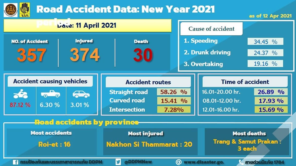 タイ正月(ソンクラーン)休暇の時期は「危険は7日間」と言われ、交通事故が多発します。タイ王国内務省災害防止軽減局 (Department of Disaster Prevention and Mitigation:DDPM)は2021年4月12日、タイ正月休暇2日目の4月11日に発生した交通事故についての発表を行いました。