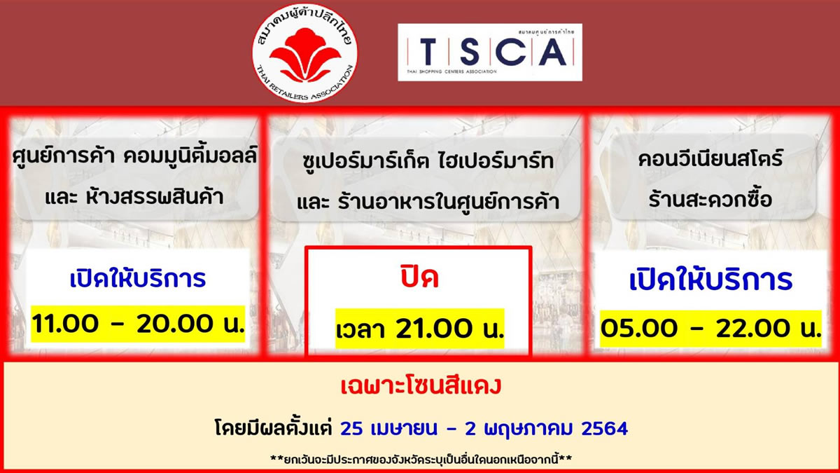 タイ小売業協会(สมาคมผู้ค้าปลีกไทย Thai Retailers Association)は2021年4月24日(土)、危険エリア「レッドゾーン」に指定されたバンコクをはじめとした18都県で4月25日(日)から5月2日(日)まで、スーパーやハイパーマーケットを除くすべてのショッピングモールやデパートの営業時間を、午前11時から午後8時までの営業とすると発表しました。