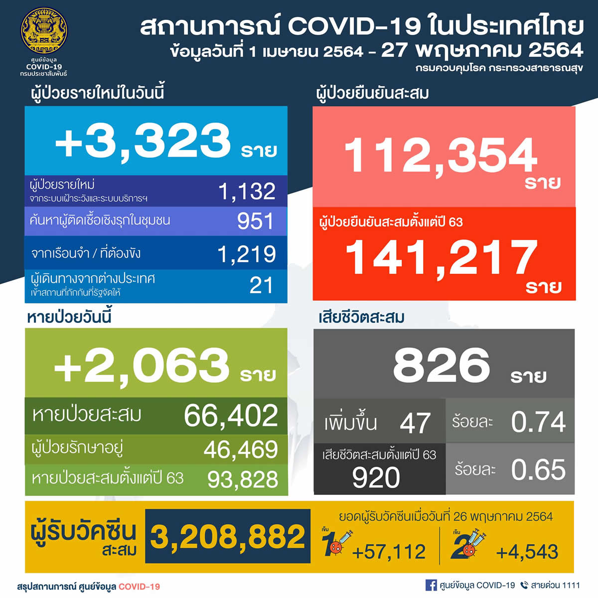 タイCOVID-19状況管理センター<the Centre for Covid-19 Situation Administration:CCSA>は2021年5月27日(木)、新たに3,323人の新型コロナウイルス陽性者を確認したと発表しました。その内1,219人は刑務所で発生したクラスターによるものでした。また過去最高の47人が1日で死亡しました。