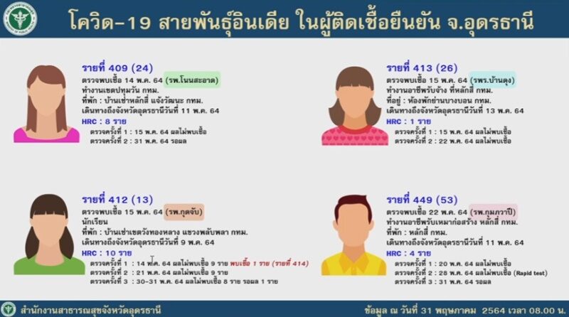 報告によると、4人全員がバンコクからウドンタニを訪れており、そのうち3人は先にインド型変異株が検出されたラクシー地区に関係し、もう1人はラクシー地区と関係していませんでした。