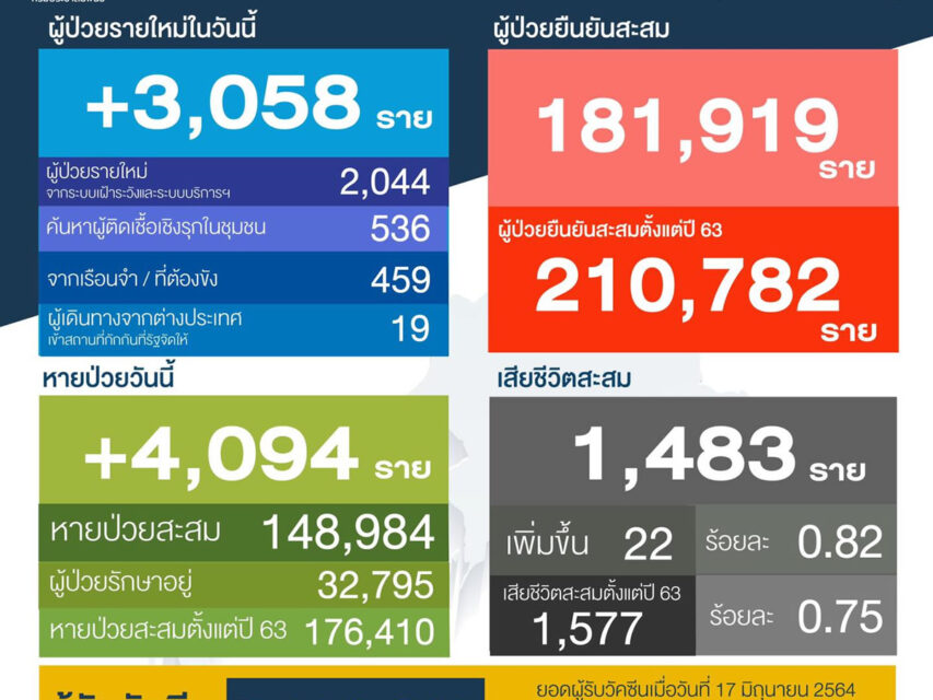 タイCOVID-19状況管理センター<the Centre for Covid-19 Situation Administration:CCSA>は2021年6月18日(金)、1日で新たに3,058人の新型コロナウイルス... Continue reading