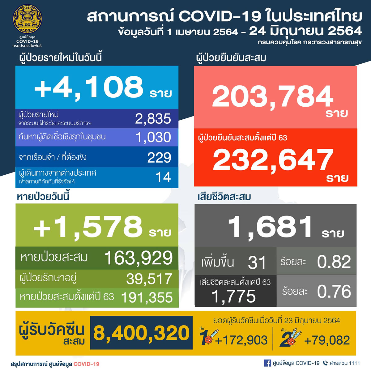 タイCOVID-19状況管理センター<the Centre for Covid-19 Situation Administration:CCSA>は2021年6月24日(木)、1日で新たに4,108人の新型コロナウイルス陽性者を確認したと発表しました。また31人が死亡しています。