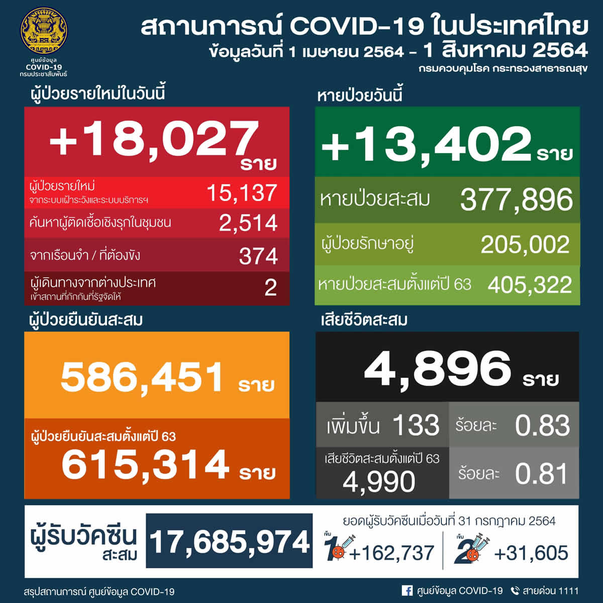 タイCOVID-19状況管理センター<the Centre for Covid-19 Situation Administration:CCSA>は2021年8月1日(日)、1日で新たに18,027人の新型コロナウイルス陽性者を確認したと発表しました。また133人が死亡しています。