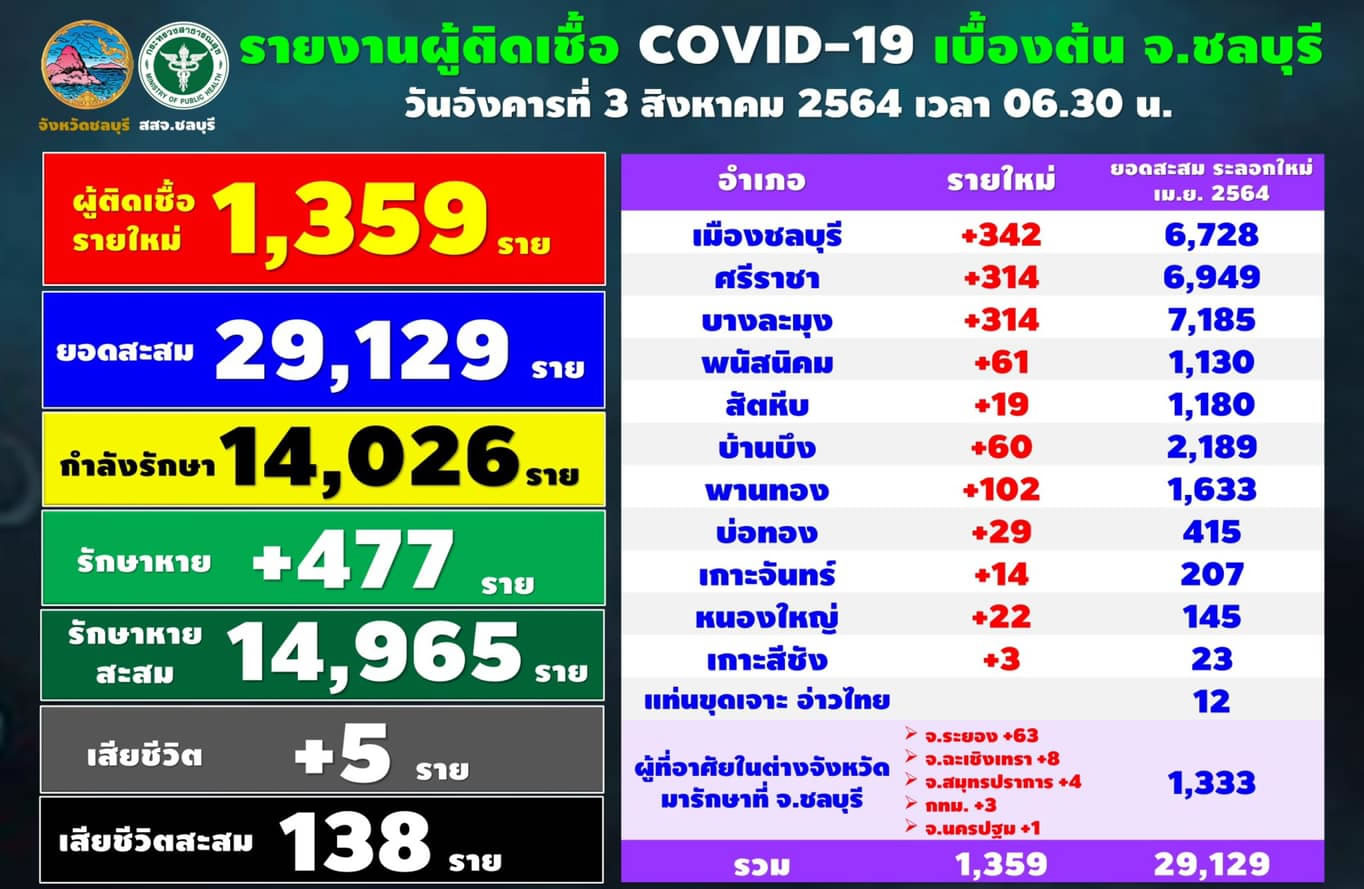 発表によると、チョンブリ県内で新たに1日で確認された新型コロナウイルス陽性者は1,359人。また、5人が死亡しました。