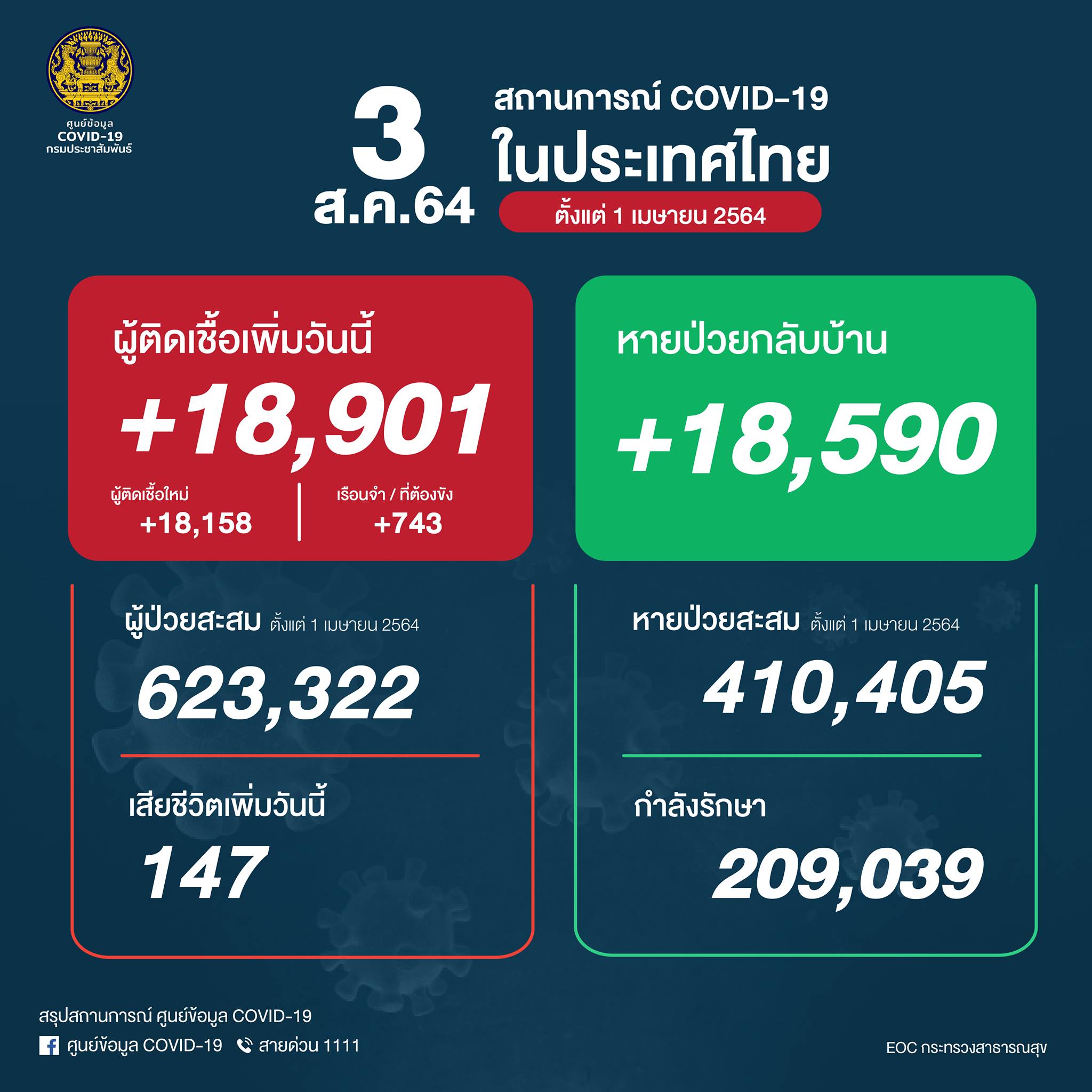 タイ保健省は2021年8月3日(火)朝、1日で確認された新型コロナウイルス陽性者が18,901人だったと発表しました。また147人が死亡しました。