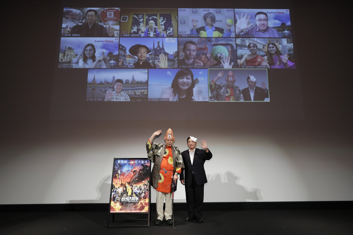 会場となったところざわサクラタウンのジャパンパビリオンホールには、映画『妖怪大戦争 ガーディアンズ』と舞台となった所沢市から、藤本正人所沢市長が狐面を着けて登壇。さらに映画の製作総指揮を務めた荒俣宏は「妖怪の道がない!これ(ステージへの階段)は人間の道だ、、」とステージをよじ登りながら登場。各国、各県の代表は、妖怪のコスプレや国を代表する衣装をまとってリモートでの参加となった。
