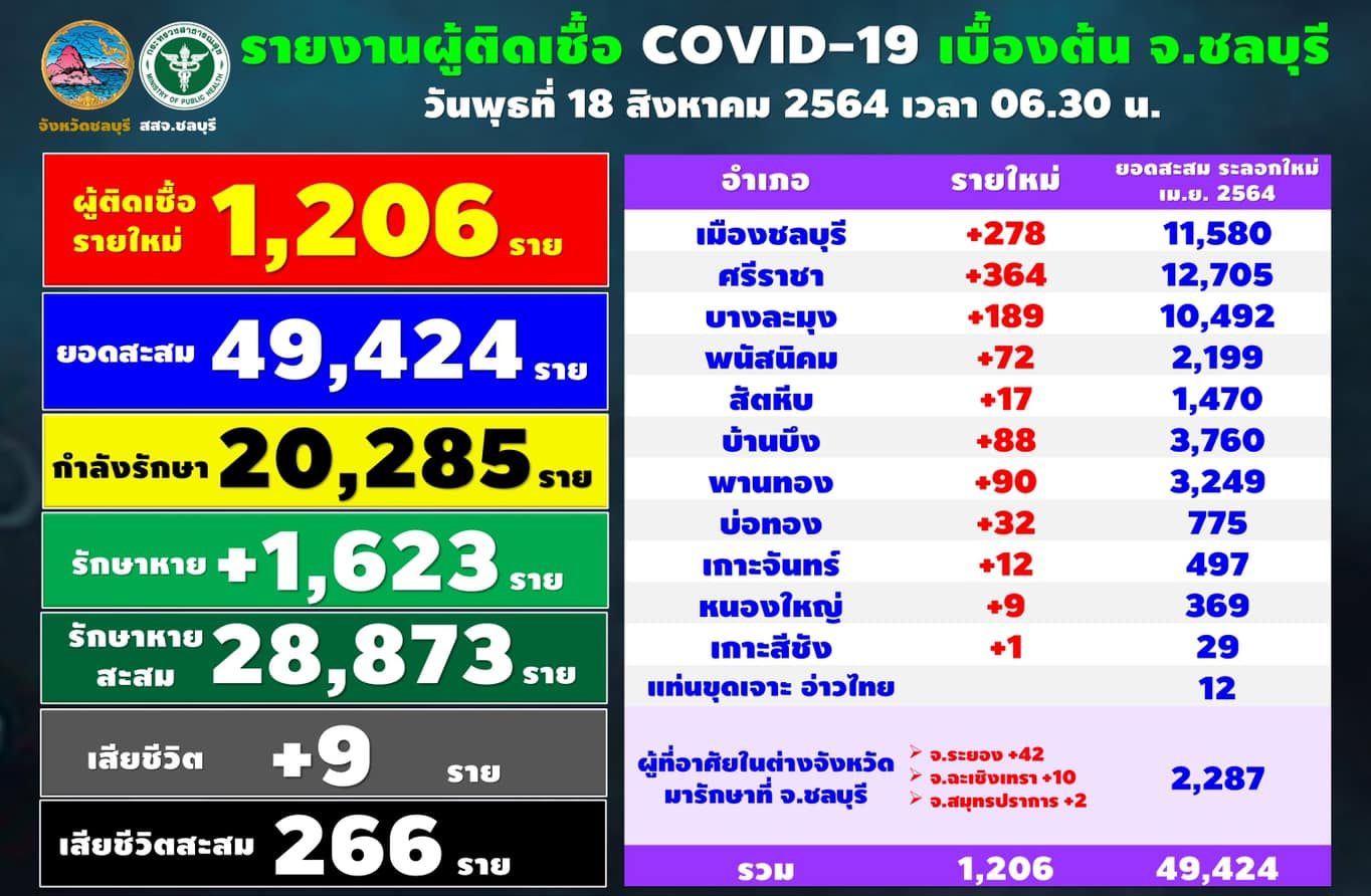 発表によると、チョンブリ県内で新たに1日で確認された新型コロナウイルス陽性者は1,206人で死亡者が9人。1,623人が回復しました。