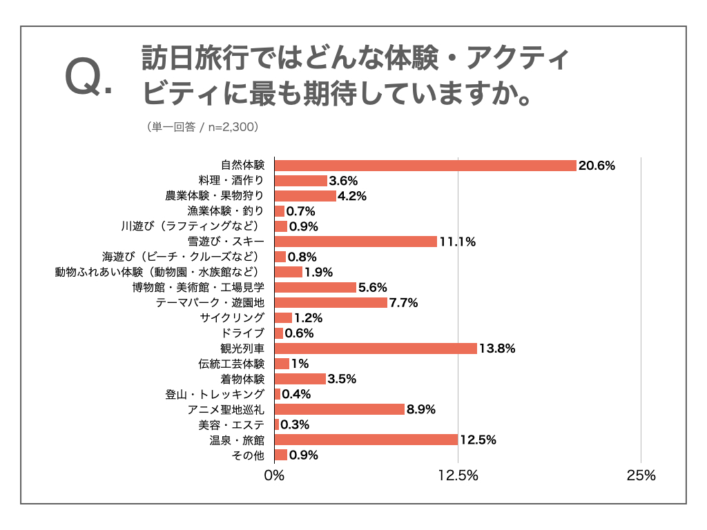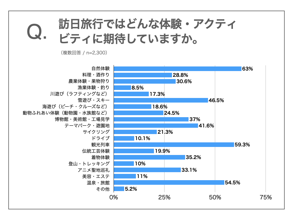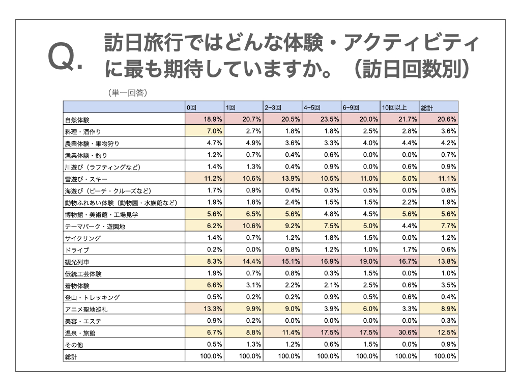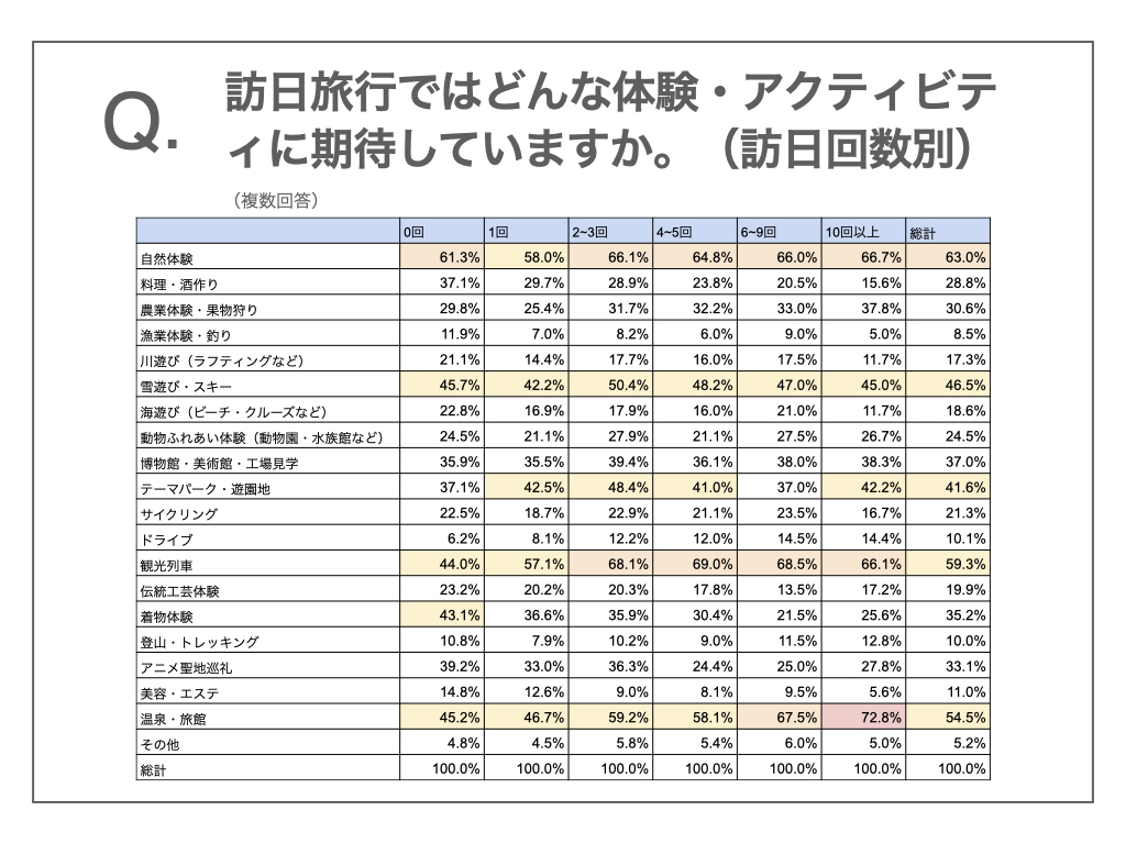 ・回答者の訪日回数別に見ると、訪日回数が増えるほど「観光列車」や「温泉・旅館」の項目が増加しており、リピーターに非常に人気の高い体験・アクティビティだということがうかがえます。「農業体験・果物狩り」「ドライブ」「サイクリング」「登山・トレッキング」も人気が高まる傾向があります。一方で「着物体験」「料理・酒作り」「アニメ聖地巡礼」などは訪日回数が多くなるほど期待値は落ち着く傾向となっています。
