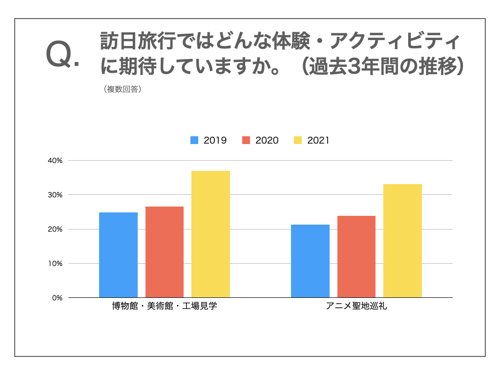 ・過去3年間で「アニメ聖地巡礼」が大幅に伸びています。これは「鬼滅の刃」など日本のアニメの人気の高まりを反映していると考えられます。さらに「博物館・美術館・工場見学」も「ジブリ美術館」や「伊賀流忍者博物館」が根強い人気となっており、注目のコンテンツとして関心が高まっています。