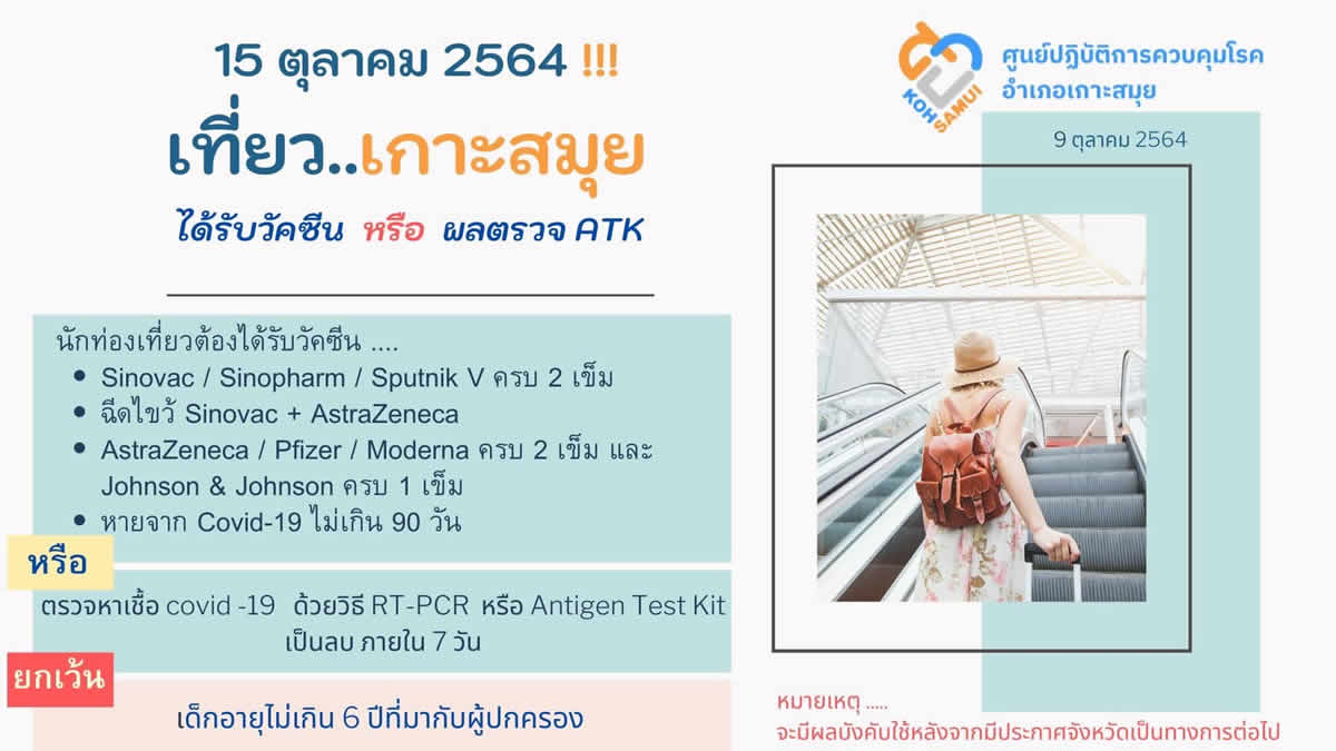 タイ南部のリゾートアイランド・サムイ島では2021年10月15日(金)より、国内移動でのサムイ島への入域要件を緩和します。この措置は、再開された国内旅行キャンペーン「ラオティアオドゥアイカン」に合わせてのものです。