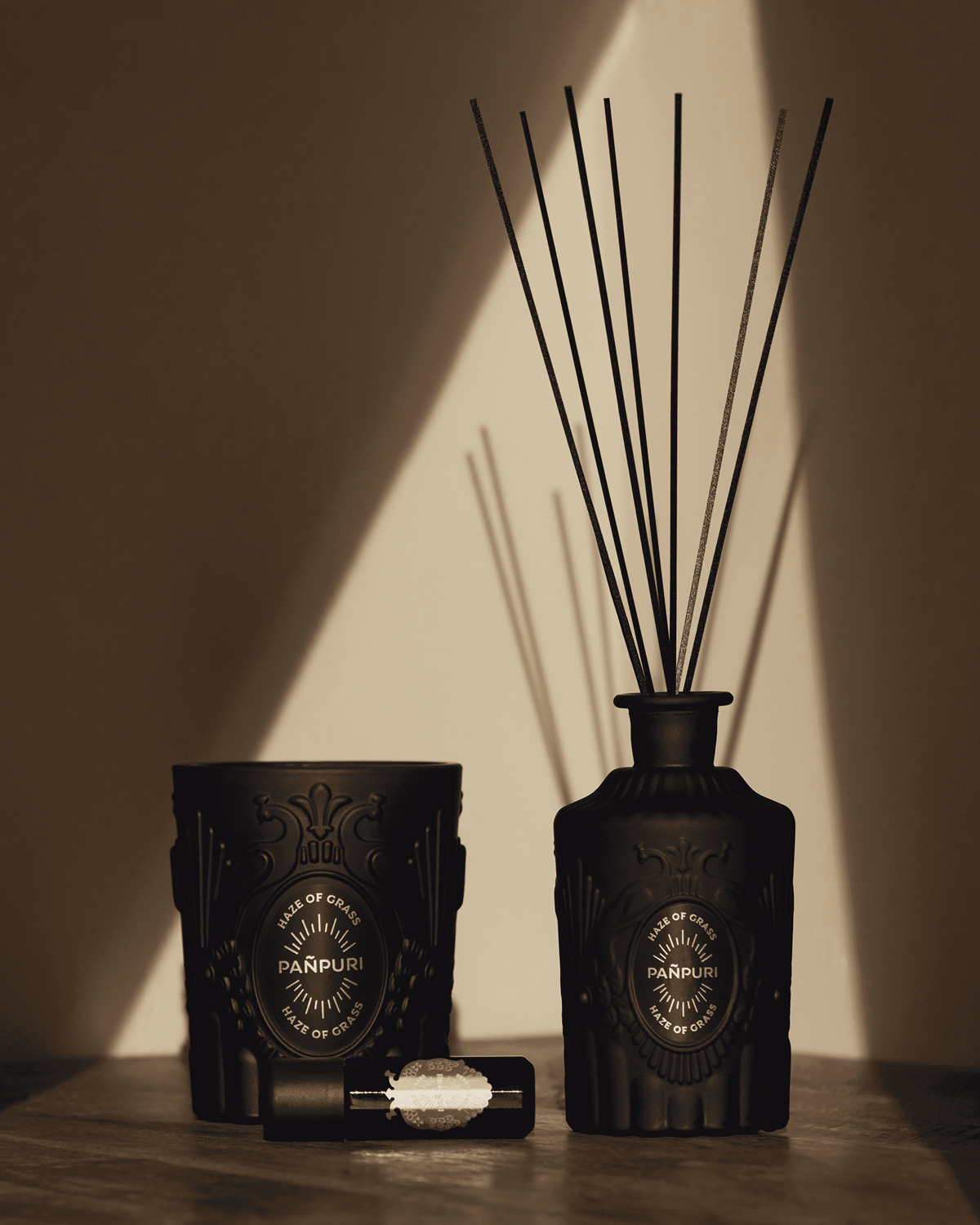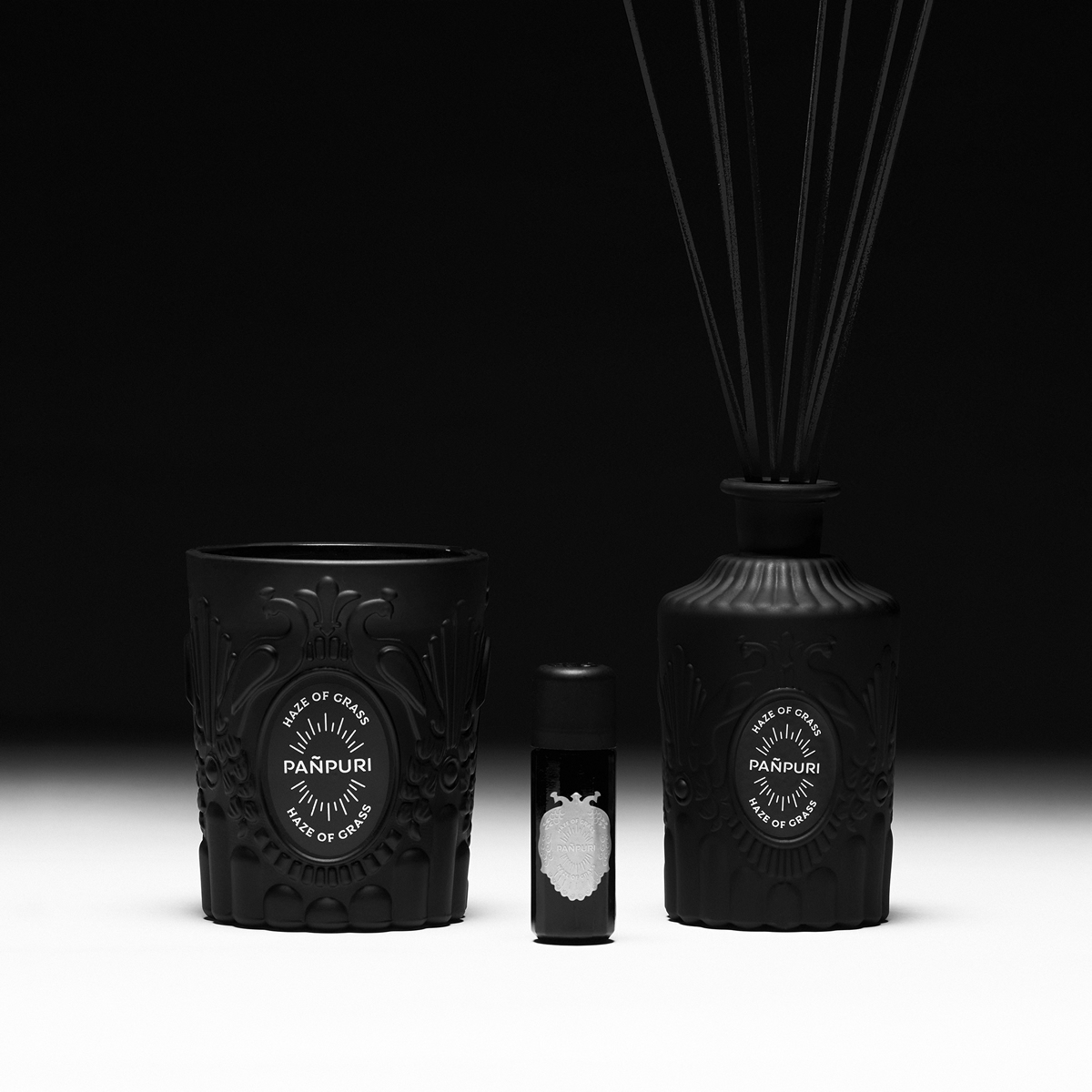 いずれもパンピューリのエンブレムが印象的な美しいブラックのガラス容器で、空間を選ばず、どこにおいても香りをお楽しみいただけます。また一緒にディスプレイしても美しい専用ボックスも付属するので、ご自身へのご褒美や、大切な方への贈り物としても。