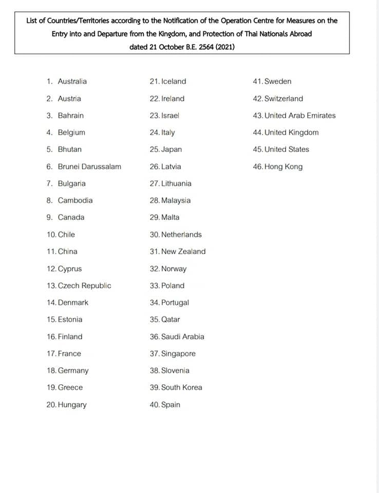 10月21日にタイ外務省は、11月1日からの再開国の対象となる46カ国を発表しました。