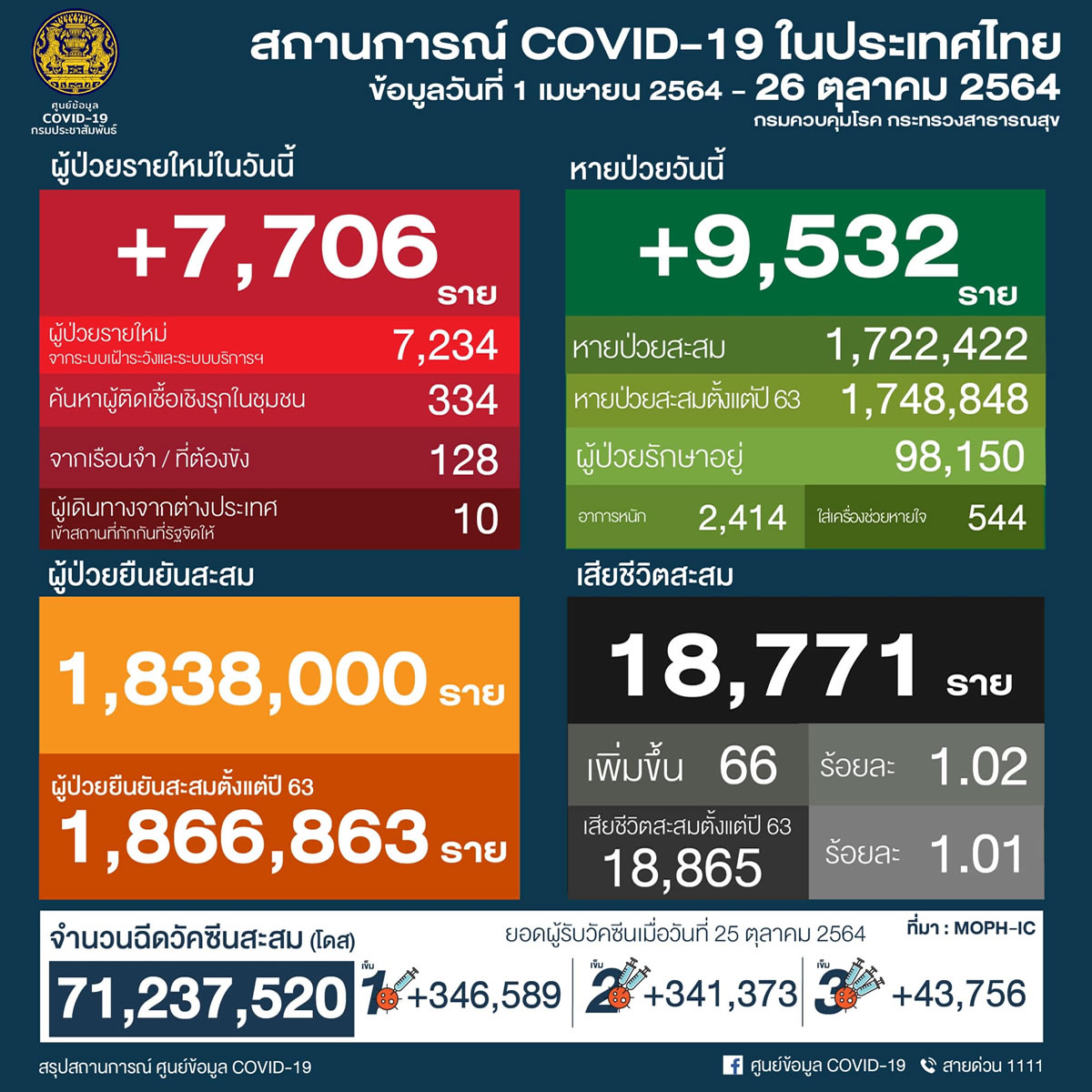 タイCOVID-19状況管理センター<the Centre for Covid-19 Situation Administration:CCSA>は2021年10月26日(火)、1日で新たに7,706人の新型コロナウイルス陽性者を確認したと発表しました。また66人が死亡しています。回復したのは9,532人でした。