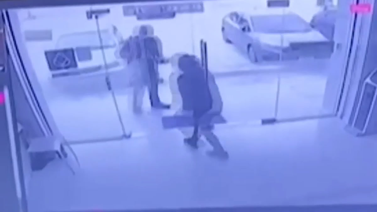 銀行強盗のためにドアを開ける警備員、防犯カメラの映像より