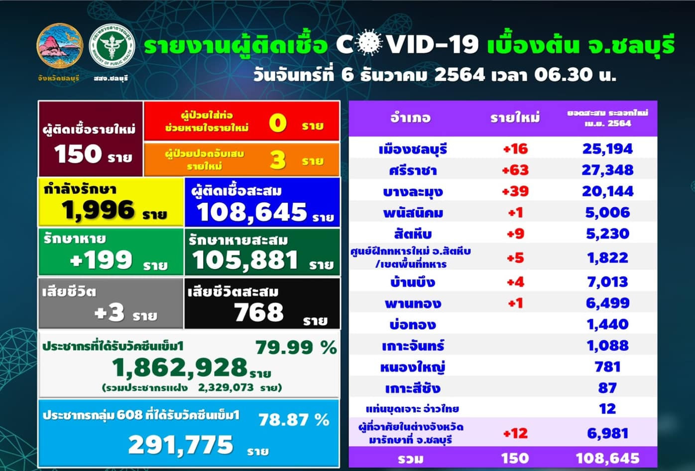 タイ東部チョンブリ県は2021年12月6日(月)朝6時半、新型コロナウイルスの最新の感染状況を発表しました。